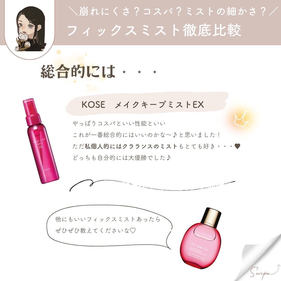 フィックスミストを6種類 色々比較してまとめてみました♡ ぜひ保存してフィックスミスト買う時の 参考にしてみてくださいね♡ 崩れにくさは勿論、 デザインの可愛さ コスパの良さ ミストの細かさ 香り などなど...人によって求める物は様々ですよね💭