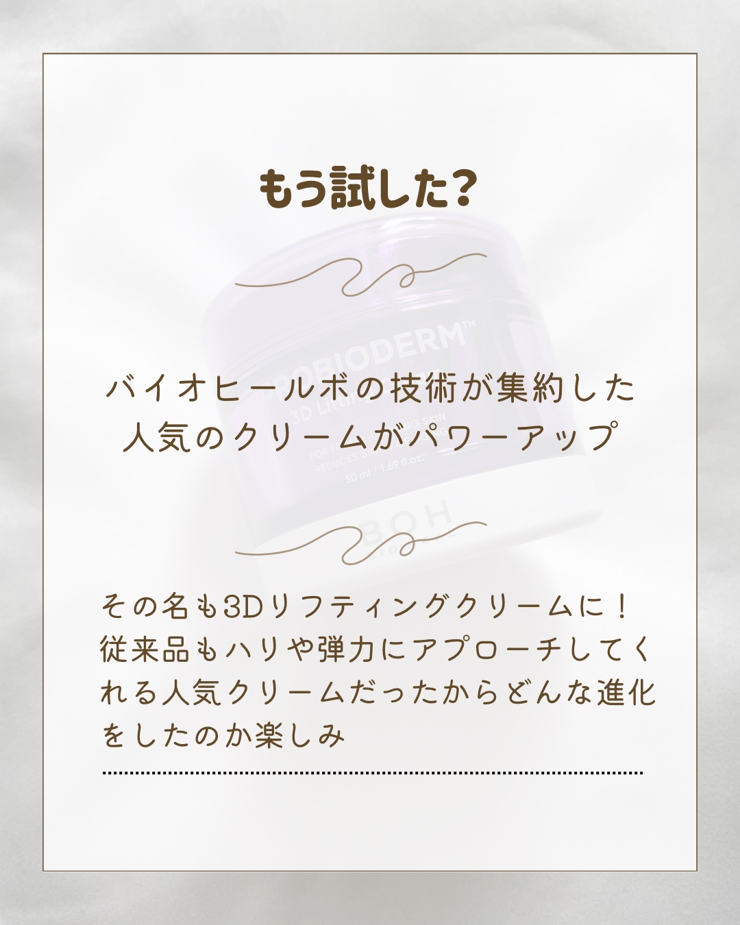 - プロバイオダーム™ 3D リフティングクリーム ・既存のタンタンクリームが、より一層のハリ弾力ケアができる商品としてパワーアップ※! ★プロバイオダーム™ 3Dリフティングクリームリニューアルポイント★ ①BIOHEAL BOHが厳選した乳酸菌*のみ配合した独自保湿成分!「プロバイオダーム™」 BIOHEAL BOHの厳しい審査のもとに選び抜かれた肌バリアをサポートする独自の乳酸菌*でハリ弾力ケアを! →キーワード #ハリ活乳酸菌 *厳選した乳酸菌:ラクトバチルスプランタラム&ラクトバチルスラムノサス&ラクトバチルスロイテリ(全て保湿) ②肌本来の弾力維持に欠かせない成分をプラス!肌が持つ成分を補うことで、ふっくらうるおった肌のハリ感をキープ ③ペプチドが12種から17種に!肌バリアを形成。素肌をすこやかに保ちます。 ・もちっと密度の高いクリームで保湿&ハリケア。 バイオヒールボ独自の技術で肌表面をピンとハリをあたえ、よりハリ感が得られるテクスチャーを実現 ・3Dと訴求しているように、ふっくらうるおい感のある多面的な弾力ケアができることから、韓国語でしっかりハリのある様子を表現するタンタン(탄탄)のワードと組み合わせて「3Dタンタンシクリーム」という愛称ができました。 ・もちっと密度の高いクリームで弾力のある素肌に導くエイジングケア※2クリーム。 ※同商品リニューアル前に比べて ※2年齢に応じたケアの事
