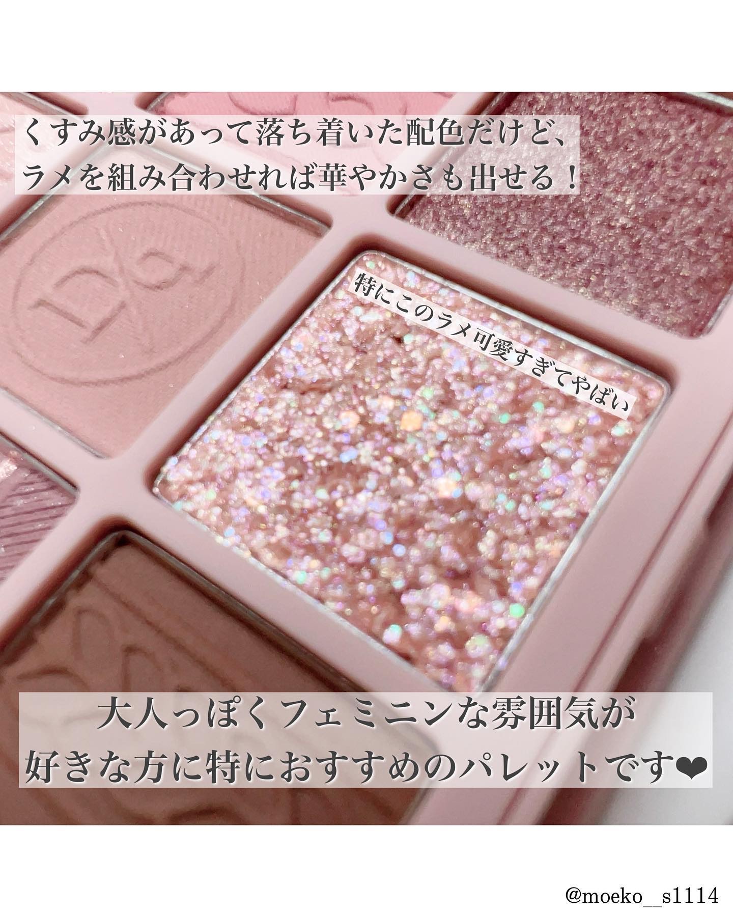 くすみピンクやブラウン、モーヴカラーが中心のふんわり配色のパレット。 得意なラメもパレットに含まれているので、すごく使いやすいです☺️ 個人的に嬉しかったのが、下段真ん中のグリッターがザラザラしてると思いきやしっとりした質感だったこと!