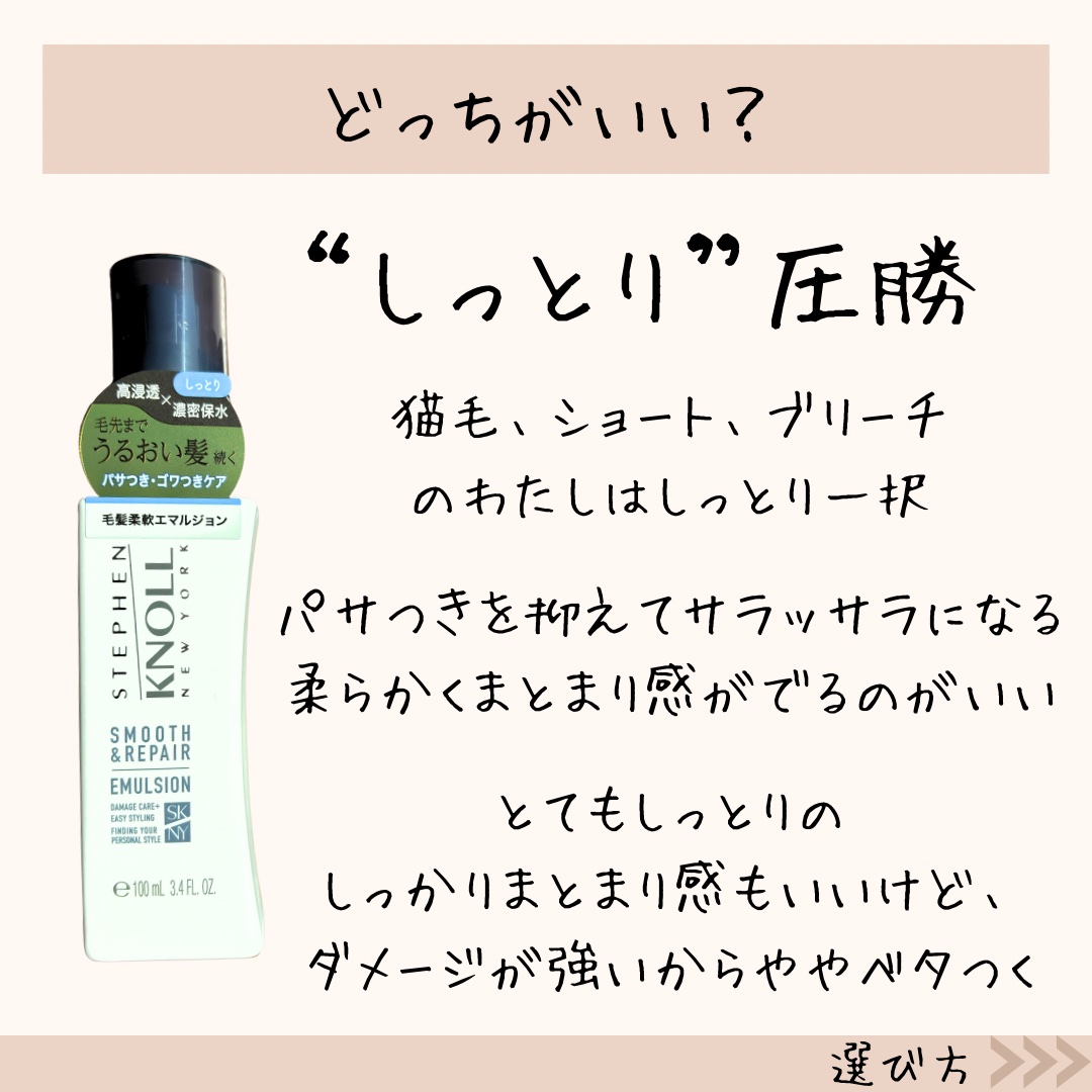サラサラしっとりの髪へ!! #スティーブンノルニューヨーク #モイスチュアソフニングエマルジョンスムースリペア 洗い流さないトリートメントです。ヘアミルクより、浸透がよく髪が柔らかくなるのを実感できます!! 高浸透補修カプセル・高浸透保水カプセルが、深層ダメージを補修。うるおいを蓄えながら、毛先までしっとりまとめます。