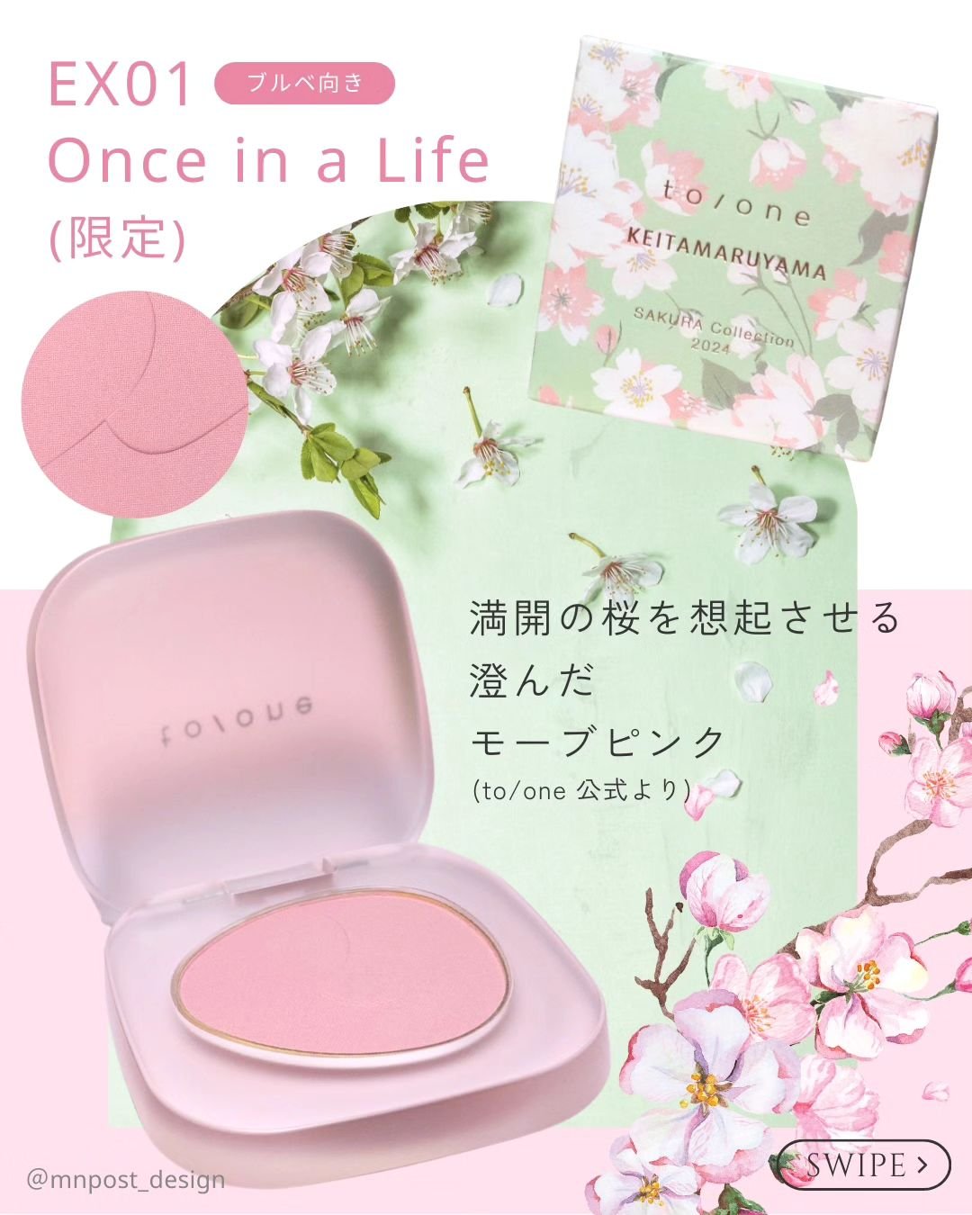 - さまざまな表情を見せる桜からインスパイアされたニュアンス違いの SAKURA カラーをラインナップ。 花びらのように繊細な肌をチークで優しく彩ります。 to/one ならではの有機的なシェイプの新コンパクト。 パウダーの表面には、花びらをイメージしたエンボスが入っています。 SAKURA Collection 限定のピンク色の容器(完売次第終了)がポイントです。 ※SAKURA パッケージが完売後、01/02/03 が定番カラーとして通常パッケージになり販売を継続します。 予約開始: 2024年3月1日(金) 先行発売:2024年3月6日(水) ※阪急うめだのみ 全国発売:2024年3月13日(水)