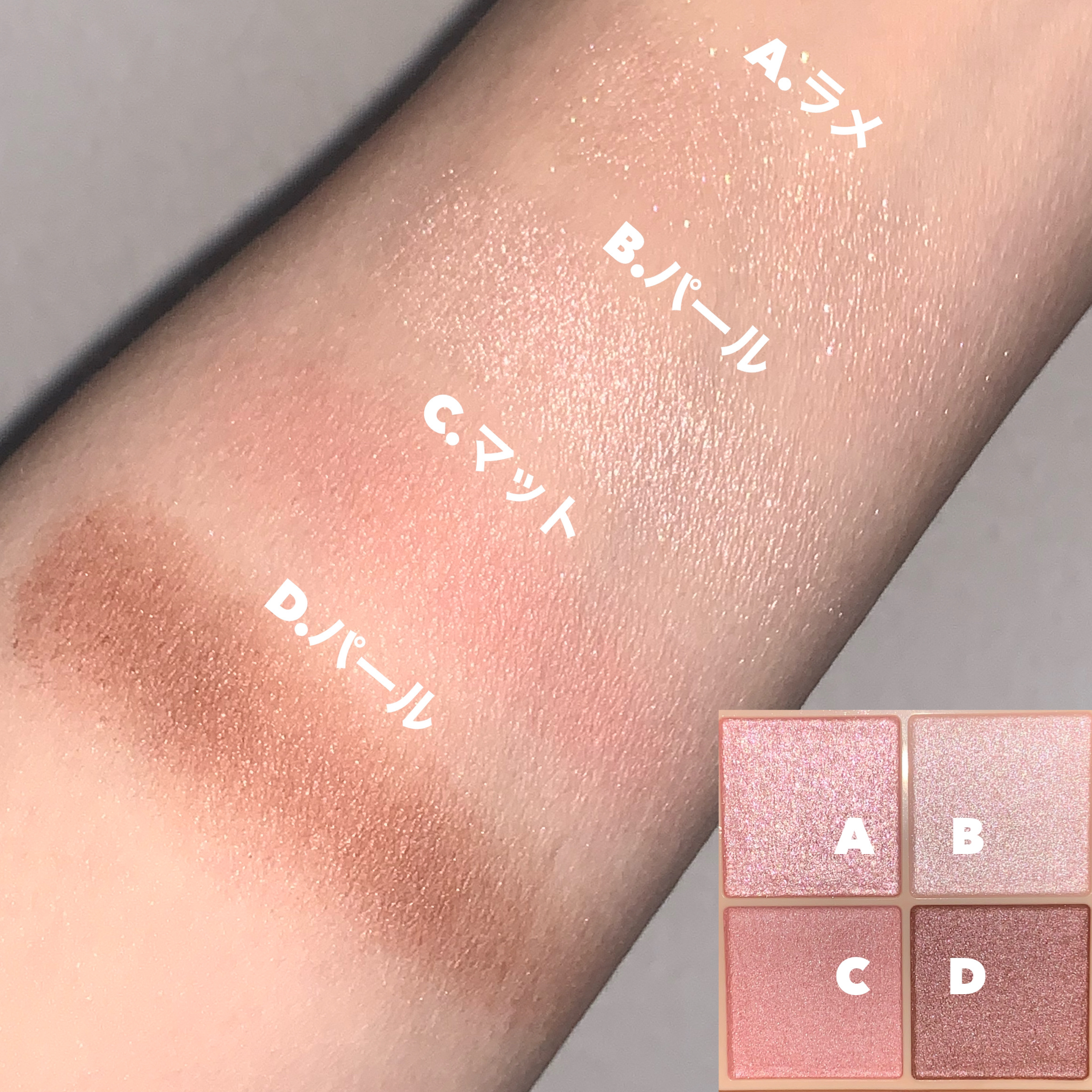 - ラメ・パール・マット3質感の4色アイシャドウ。 肌馴染みの良いベージュを基調としたカラー。ラメ・パール・マットの3質感を重ねて、自然にまぶたを強調し奥行のある大きな目元へ。 しっとり溶け込むような柔らかなパウダーなので、スルスル伸びてまぶたにピタッと密着。保湿成分(スクワラン・ホホバ種子油)配合。