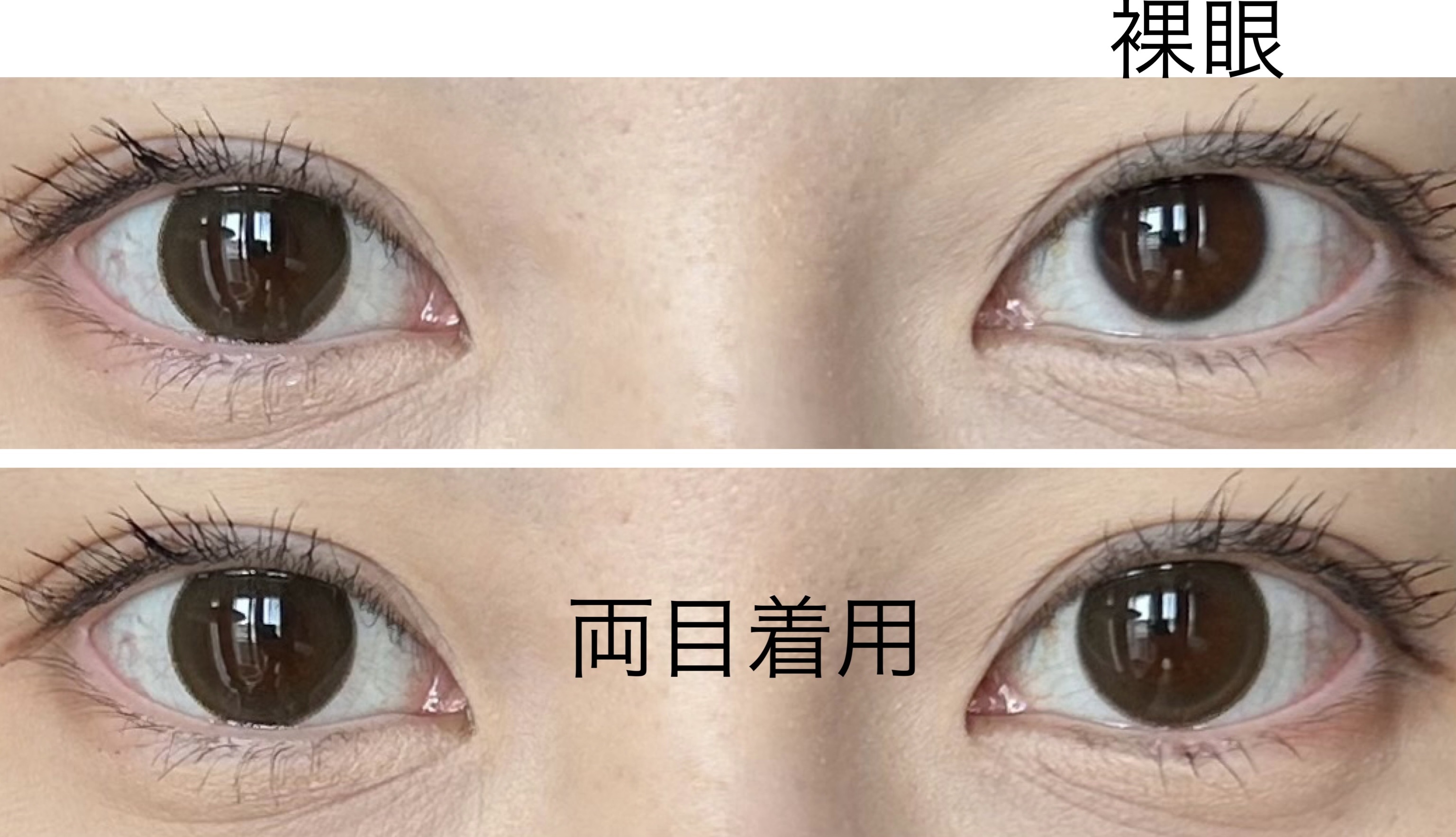 中の本当にココアみたいなくすみブラウンカラーが他には無い感じでじゅわーっとした発色が最高ですね 中のカラーが明るめでリング状になってると結構派手な感じになりやすいんですが、このじゅわっとした感じのおかげでそこまで派手だったりキツくは見えないです きゅるっと丸い目に見えて本当に可愛らしい印象になりつつ立体感がしっかり出て、写真盛れも現実盛れも間違いない気がします