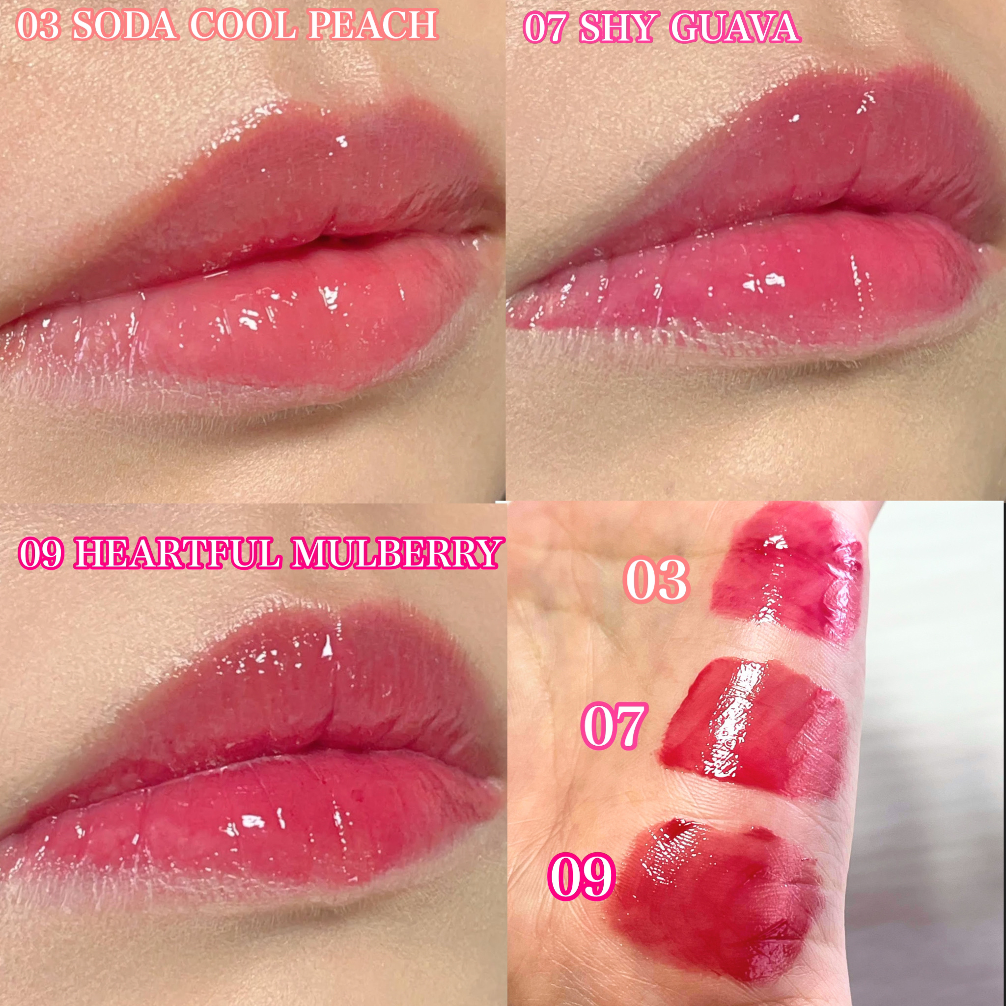 - <00.PEARL GLOSS> 水添ポリイソブテン、カプリル酸/カプリン酸トリグリセリド、リンゴ酸ジイソステアリル、パルミチン酸デキストリン、乳酸メンチル、1,2-ヘキサンジオール、ホウケイ酸アルミニウムカルシウム、香料、二酸化チタン。、酸化スズ <01.FLASHING APRICOT> 精製水、アジピン酸ビス-ジグリセリルポリアクリル-2、マレイン酸ジイソステアリル、ジフェニルジメチコン、オクチルドデカノール、グリセリン、セチルPEG/PPG-10/1ジメチコン、ジプロピレングリコール、エチルセルロース、イソステアリン酸ソルビタン、ペンチレングリコール、アクリル酸ヒドロキシエチル/アクリロイルジメチルタウリン酸ナトリウム共重合体、スクワラン、セテアレス-20、ステアロイルグルタミン酸ナトリウム、二酸化チタン、エタノール、フェノキシエタノール、ポリソルベート60、香料、カプリル酸グリセリル、黄色4号5、イエローNO. 227、エチルヘキシルグリセリン、赤色NO. 104、レッドNO. 1 (XNUMX)、水酸化アルミニウム、ポリアクリル酸アンモニウム、ブチレングリコール、テトラ-ジ-T-ブチルヒドロキシヒドロ桂皮酸ペンタエリスリチル <02.DEWY GRAPEFRUIT> 精製水、アジピン酸ビス-ジグリセリルポリアクリル-2、マレイン酸ジイソステアリル、ジフェニルジメチコン、オクチルドデカノール、グリセリン、セチルPEG/PPG-10/1ジメチコン、ジプロピレングリコール、エチルセルロース、イソステアリン酸ソルビタン、ペンチレングリコール、アクリル酸ヒドロキシエチル/アクリロイルジメチルタウリン酸Na、スクワラン、セテアレス-20、ステアロイルグルタミン酸Na、エタノール、二酸化チタン、フェノキシエタノール、ポリソルベート60、香料、カプリル酸グリセリル、黄色5号227、レッドNO. 4、イエローNO. 104、エチルヘキシルグリセリン、赤色NO. 1 (XNUMX)、水酸化アルミニウム、ポリアクリル酸アンモニウム、ブチレングリコール、テトラ-ジ-T-ブチルヒドロキシヒドロ桂皮酸ペンタエリスリチル <03.SODA COOL PEACH> 精製水、アジピン酸ビスジグリセリルポリアクリル酸-2、マレイン酸ジイソステアリル、ジフェニルジメチコン、オクチルドデカノール、グリセリン、セチルPEG/PPG-10/1ジメチコン、ジプロピレングリコール、エチルセルロース、イソステアリン酸ソルビタン、ペンティレングリコール、アクリル酸ヒドロキシエチル/アクリロイルジメチルタウリン酸Na、スクワラン、セテアレス-20、ステアロイルグルタミン酸Na、エタノール、フェノキシエタノール、二酸化チタン、ポリソルベート60、香料、カプリル酸グリセリル、赤色NO. 104 (1)、エチルヘキシルグリセリン、黄色No. 5、レッドNO. 227、イエローNO. 4、水酸化アルミニウム、ポリアクリル酸アンモニウム、青色NO. 1、ブチレングリコール、ペンタエリスリチルテトラ-ジ-T-ブチルヒドロキシヒドロシンナメート <04.ADORABLE BERRY> 精製水、アジピン酸ビス-ジグリセリルポリアクリル-2、マレイン酸ジイソステアリル、ジフェニルジメチコン、オクチルドデカノール、グリセリン、セチルPEG/PPG-10/1ジメチコン、ジプロピレングリコール、エチルセルロース、イソステアリン酸ソルビタン、Pエチレングリコール、アクリル酸ヒドロキシエチル/アクリロイルジメチルタウリン酸Na、スクワラン、セテアレス-20、ステアロイルグルタミン酸Na、エタノール、フェノキシエタノール、ポリソルベート60、香料、カプリル酸グリセリル、赤色NO. 104 (1)、二酸化チタン、エチルヘキシルグリセリン、赤色 NO. 227、イエローNO. 5、イエローNO. 4、水酸化アルミニウム、ポリアクリル酸アンモニウム、ブチレングリコール、テトラ-ジ-T-ブチルヒドロキシヒドロケイ皮酸ペンタエリスリチル、青色NO. 1 <05.SWEET PERSIMMON> 精製水、ポリアシルアジピン酸ビスジグリセリル-2、マレイン酸ジイソステアリル、ジフェニルジメチコン、オクチルドデカノール、グリセリン、セチルPEG/PPG-10/1ジメチコン、ジプロピレングリコール、エチルセルロース、イソステアリン酸ソルビタン、ペンチレングリコール、アクリル酸ヒドロキシエチル/ナトリウムアクリロイルジメチルタウリン共重合体、スクワラン、セテアレス-20、ステアロイルグルタミン酸Na、エタノール、二酸化チタン、フェノキシエタノール、ポリソルベート60、香料、黄色5号、カプリル酸グリセリル、赤色227号、エチルヘキシルグリセリン、水酸化アルミニウム、ポリアクリル酸アンモニウム、黄色4号、赤色104号(1)、青色1号、ブチレングリコール、ペンタエリスリチルテトラ-ジ-t-ブチルヒドロキシヒドロシンナメート <07.SHY GUAVA> 精製水、ポリアシルアジピン酸ビスジグリセリル-2、マレイン酸ジイソステアリル、ジフェニルジメチコン、オクチルドデカノール、グリセリン、セチルPEG/PPG-10/1ジメチコン、ジプロピレングリコール、エチルセルロース、イソステアリン酸ソルビタン、ペンチレングリコール、アクリル酸ヒドロキシエチル/ナトリウムアクリロイルジメチルタウリン共重合体、ス