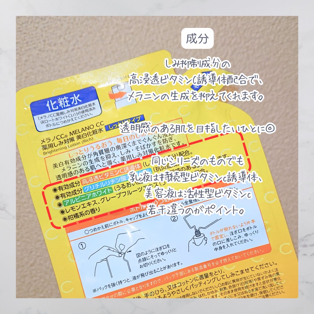 - 「メラノCC 薬用しみ対策 美白化粧水 しっとりタイプ」は、顔全体にうるおいを与えながら、しみ対策できる薬用美白化粧水。 美白有効成分の高浸透ビタミンC誘導体*1が角質層のすみずみまで浸透し、メラニンの生成を抑え、しみ・そばかすを防ぎ、透明感のある肌へと導きます。 また、抗炎症成分*2と3種のうるおい成分*3を配合。ニキビ痕が気になる肌にもうるおいを与え、肌を整えます。 さわやかな柑橘系の香りです。 *1:3-O-エチルアスコルビン酸 *2:グリチルリチン酸ジカリウム *3:アルピニアホワイト、レモンエキス、グレープフルーツエキス