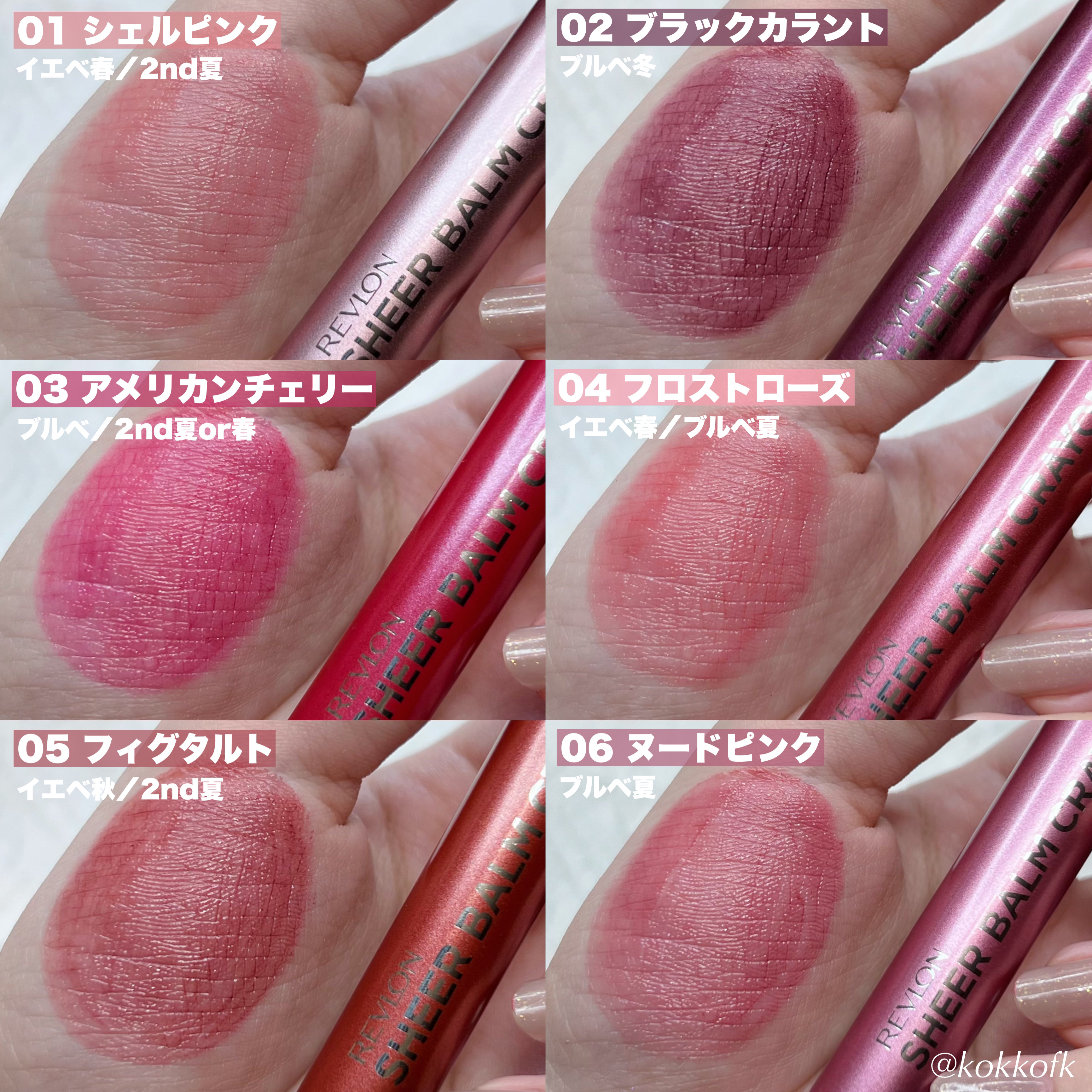 このバームはワセリンのようなとにかくうるうるの透明ツヤ感で、唇に負担なく薄づきの発色です💓 やや黄みの柔らかいヌードベージュ 明るさが得意なイエベ春におすすめ! 明るく澄んだ青みピンク 明るさが得意なブルベにおすすめ! やや黄みの澄んだコーラルレッド 2ndブルベのイエベ春におすすめ! 鮮やかで澄んだ青みレッド 鮮やかさが得意なブルベにおすすめ! 柔らかいくすみベージュブラウン 柔らかい色が得意なイエベにおすすめ! やや青みの柔らかいくすみレッド 柔らかい色が得意なブルベ夏に! しっかり青みのモーブピンク 1st2ndブルベにおすすめ!
