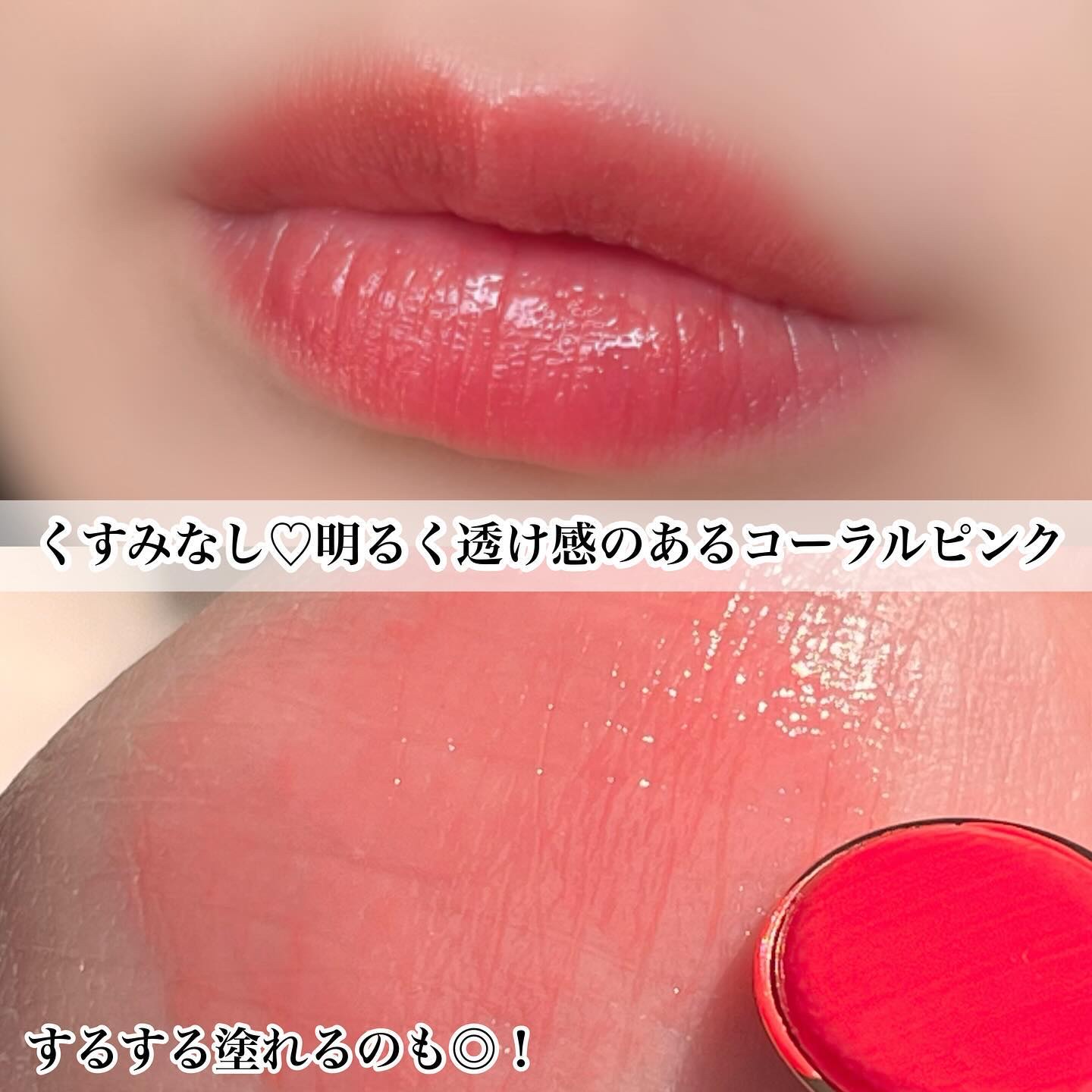多幸感あふれるクリアなコーラル🩷 特に時間が経つと蛍光感がでてきちゃう。 THEピンクのリップを求めている人にピッタリ! ティッシュオフしても若干色は残ってる! おすすめの塗り方は、いつもよりも少し濃いめに塗ってから、ティッシュオフ!