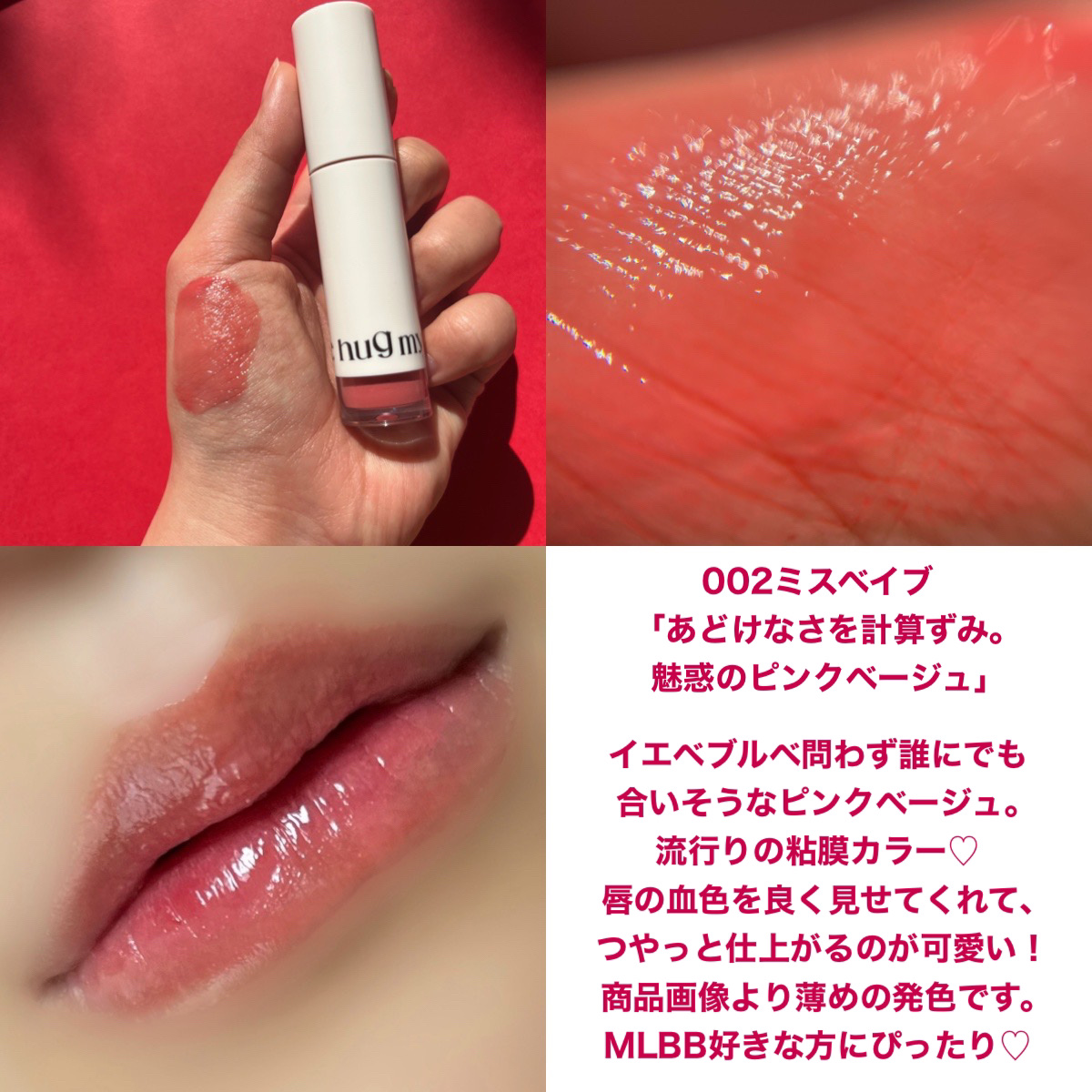 鮮やかな真紅がパッと目を引きます。 しっかり塗りでも似合う方いると思いますが、 日常使いならぽんぽん塗りがおすすめ。 万能リップ美容液…!これは以前から愛用しています。 夜にトリートメントとして塗っても良いし、 このようにグロスとして使っても可愛い。ちらちら細かいラメが入っています。