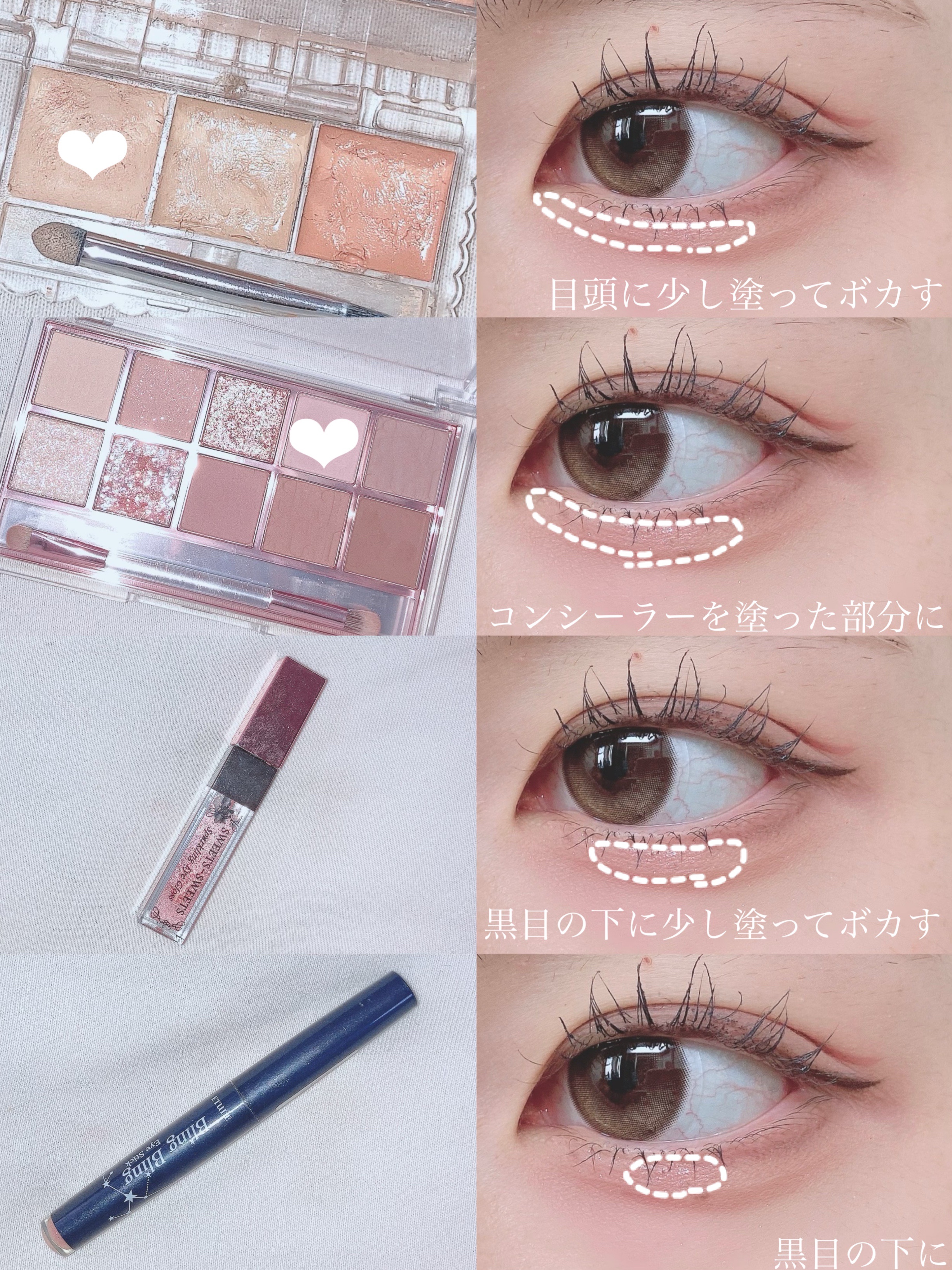 アイシャドウ👀・CLIOプロ アイ パレット01SIMPLY PINK グリッター✨・PERIPERAデュオ ポケット グリッター シャドウ03SALTED SUGARPLUM 涙袋のコンシーラー👧・キャンメイクカラーミキシングコンシーラーオレンジベージュ マスカラ💇♀️・rom&ndハンオールフィックスマスカラL02LONG ASH アイライン✏️・キャンメイククリーミータッチライナーダークブラウン・CEZANNE極細アイライナーEX20ブラウン
