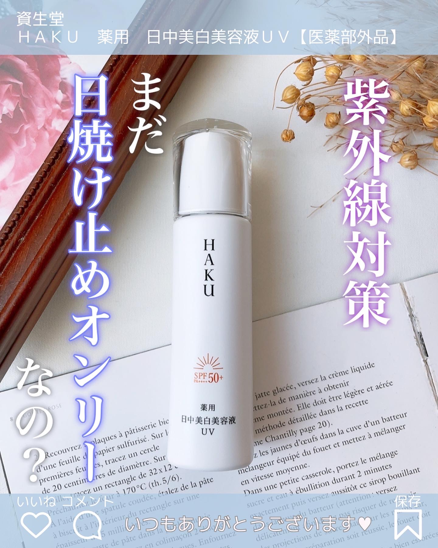 - 販売名「メラノフォーカスUV」 SPF50+・PA++++ 日中のHAKU。光を浴びる時間も味方に、日中だからできる美白ケアのアプローチ。 シミ予防研究の先端技術を搭載し、日中ならではの美白ケアを可能にした、薬用日中美白美容液です。光を浴びる時間も味方にして、明るく透明感のある肌に導きます。 ○2種の美白有効成分を肌の奥まで届け効かせる。 ○日中の肌環境に着目し、Wデイエフェクターを配合。うるおいを与え届ける。 〇ファインレッドパールαが効果的に光を放ち、シミや色ムラを目立たせない。トーンアップ効果で、明るく透明感のある仕上がり。 〇みずみずしい美容液がスーッとなじむ。化粧下地としても使える。 ○無香料・アレルギーテスト済み・ニキビのもとになりにくい処方。 (全てのかたにアレルギーが起きない、ニキビができないというわけではありません)。