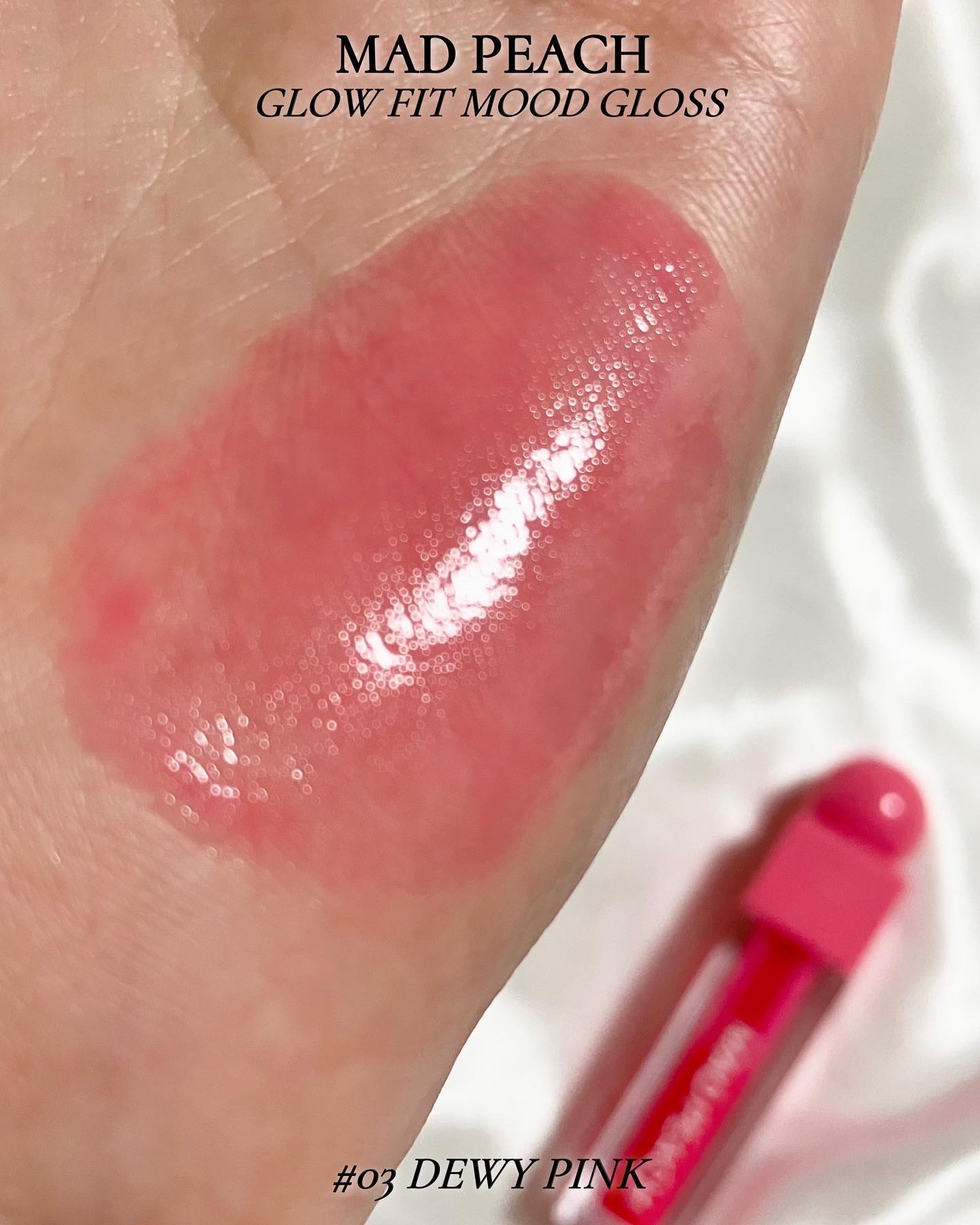 明るめで淡いヌーディピンクカラー。 私はティントの上から重ねて使う予定だったからカラーの邪魔をせずよかった✨ 単色で使う場合は唇の色をクッションやリップペンシルで整えてから使うと可愛く仕上がると思います🐰 ティントって重ねれば重ねるほど色が濃くなっていく場合が多いけどグロスならその心配がない!!