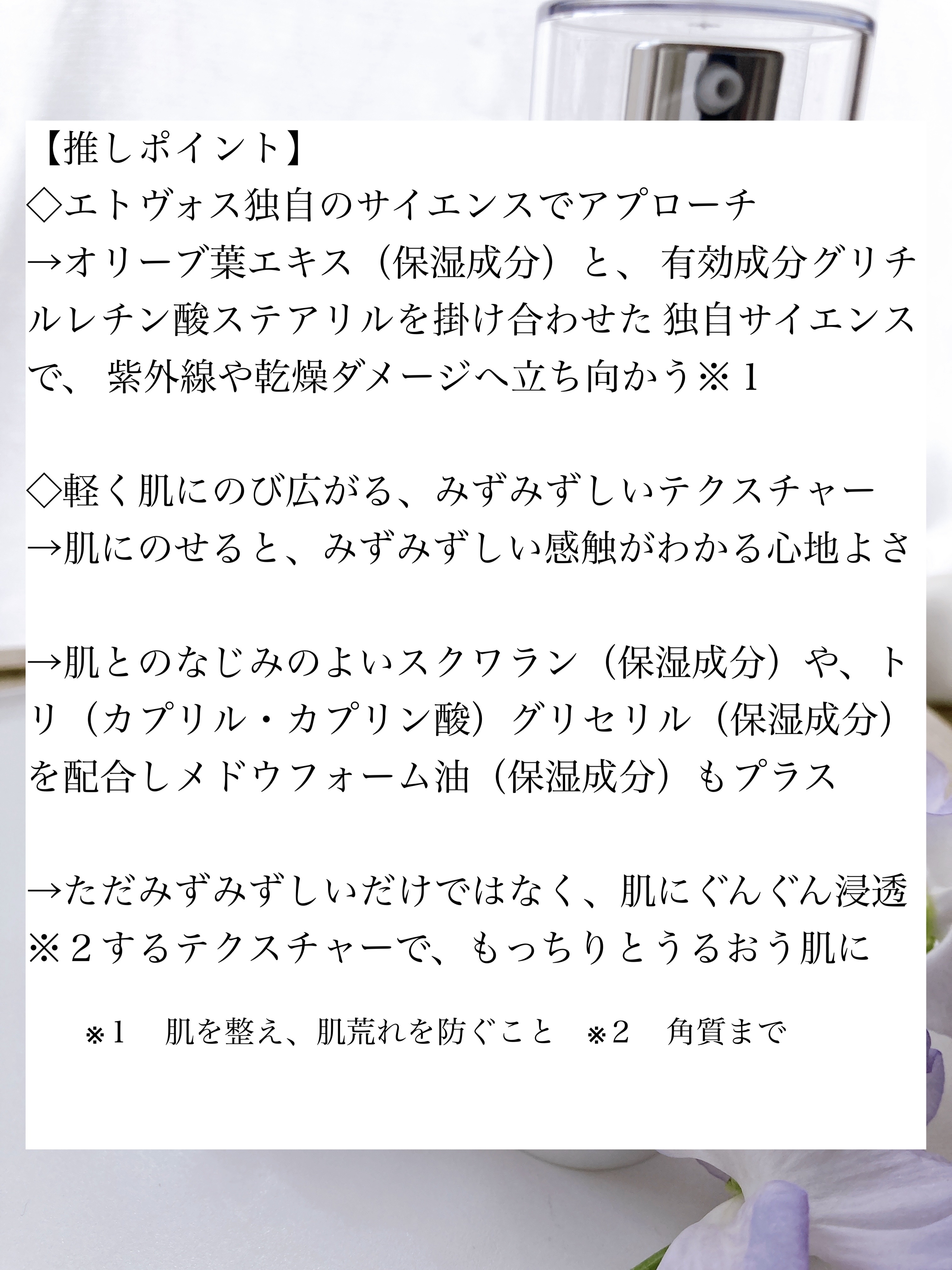 - 【医薬部外品】 POINT➀ シミ*1・くすみ*2を起こす「前ぶれダメージ*3」に独自サイエンスでアプローチ 保湿成分オリーブ葉エキスと、有効成分グリチルレチン酸ステアリルを掛け合わせたエトヴォス独自サイエンスで、紫外線や乾燥ダメージへ立ち向かいます*4。 POINT② 軽く肌にのび広がるみずみずしいテクスチャー 肌にのせると、みずみずしい感触がわかる心地よさ。肌馴染みのよい保湿成分スクワランや、保湿成分トリ(カプリル・カプリン酸)グリセリルを配合し、さらに保湿成分メドウフォーム油もプラス。肌にぐんぐん浸透*5するテクスチャーで、もっちりとうるおう肌に。 *1 メラニンの生成を抑え、シミ・そばかすを防ぐ *2 乾燥による *3 乾燥や肌荒れを防ぐこと *4 肌を整え、肌荒れを防ぐこと *5 角層まで