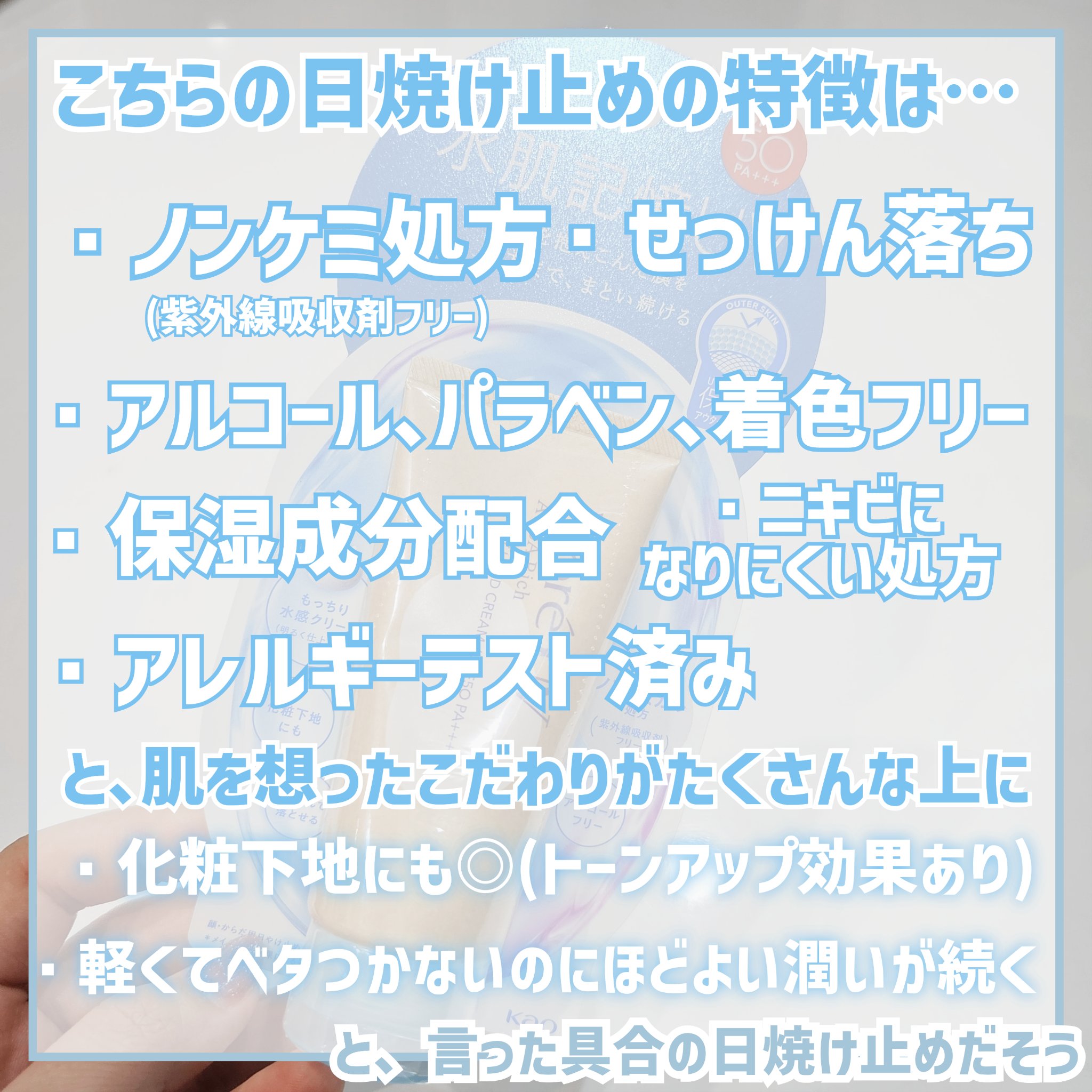 ビオレUVアクアリッチウォータリーホールドクリーム【使い方】スキンケア→🔵日焼け止め🔵→(化粧下地)→ファンデーション…【使用感】「水肌記憶UV」と謳っているだけあり、重すぎないさっぱりした保湿感で、混合肌の私には夏も冬も使いやすい。伸びが良...