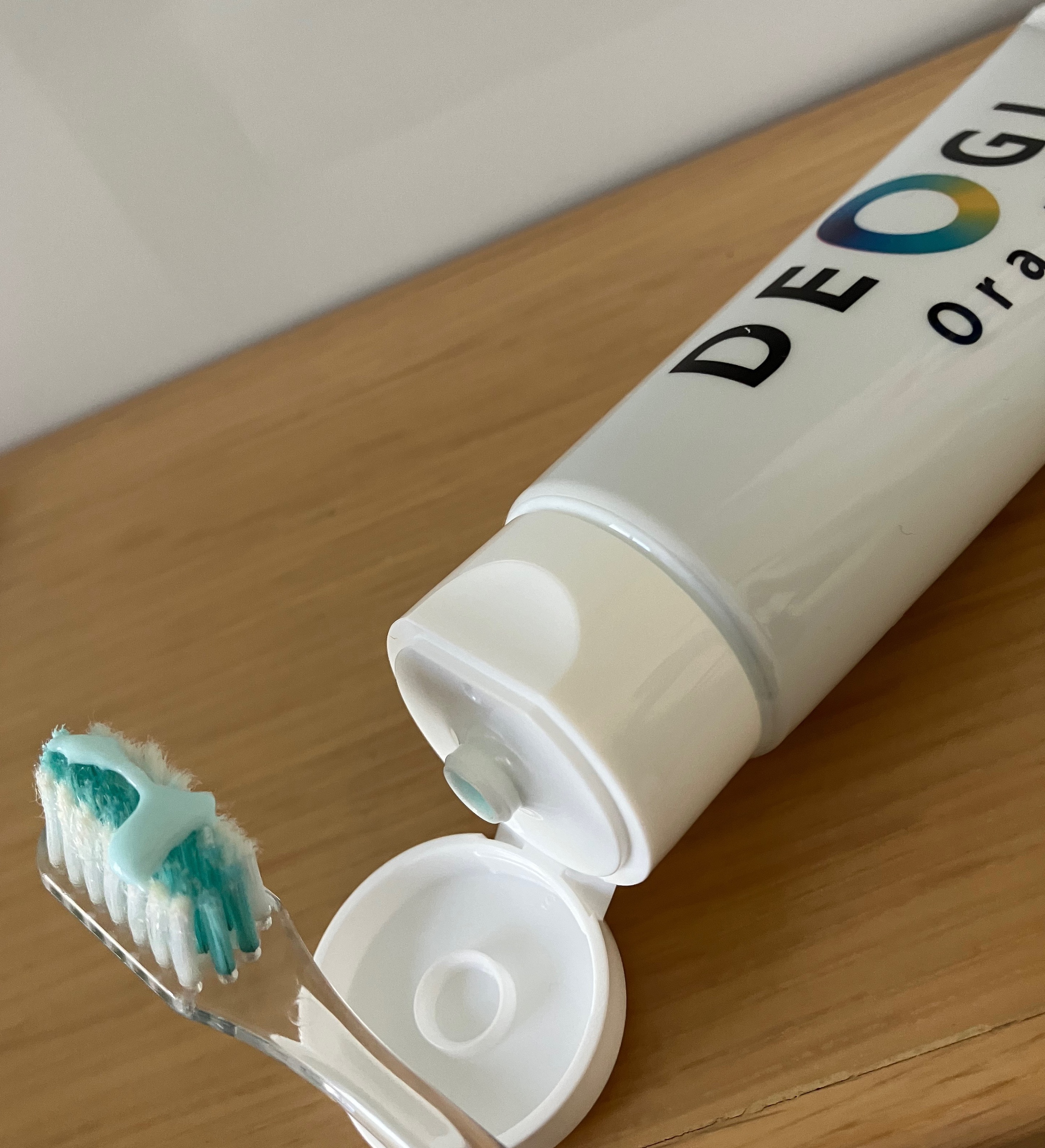 口臭ケアとホワイトニング(ブラッシングによる)の両方ができちゃう歯磨き粉なの。 防臭機能がある清掃剤DEOGLA(ホウケイ酸(Al/Ca/銅/Na))が配合されていて、口臭にも効果的なんですよ。 レモングラスの香味だけだから、全然スースーしないし、泡立ちもほとんどないから、磨いてる歯が良く見えて、隅々までしっかり磨けちゃいます。