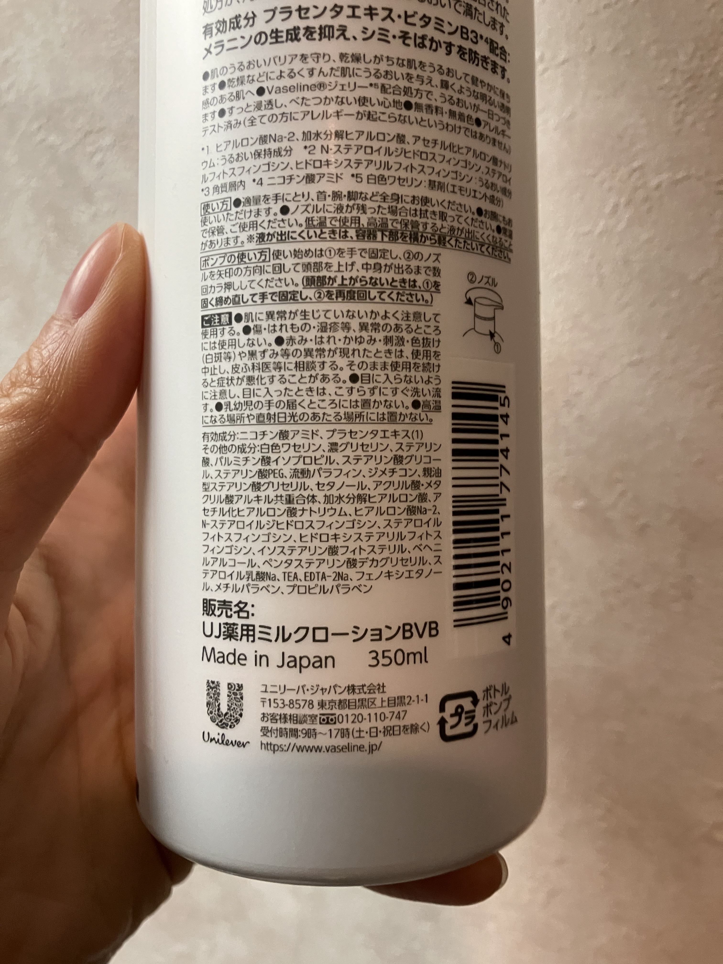 たっぷりあるので余すことなくボディに塗りたくれてよき ポンプなので必要な分衛生的に使いやすかったのも 気になったのはボトルが長いため使い切るのがなかなか難しい 底の方は斜めにしたりなどなんとか使い切れました 大容量なのでコスパいいかも まだ頂いたヴァセリンがあるのでたっぷり使っていきます