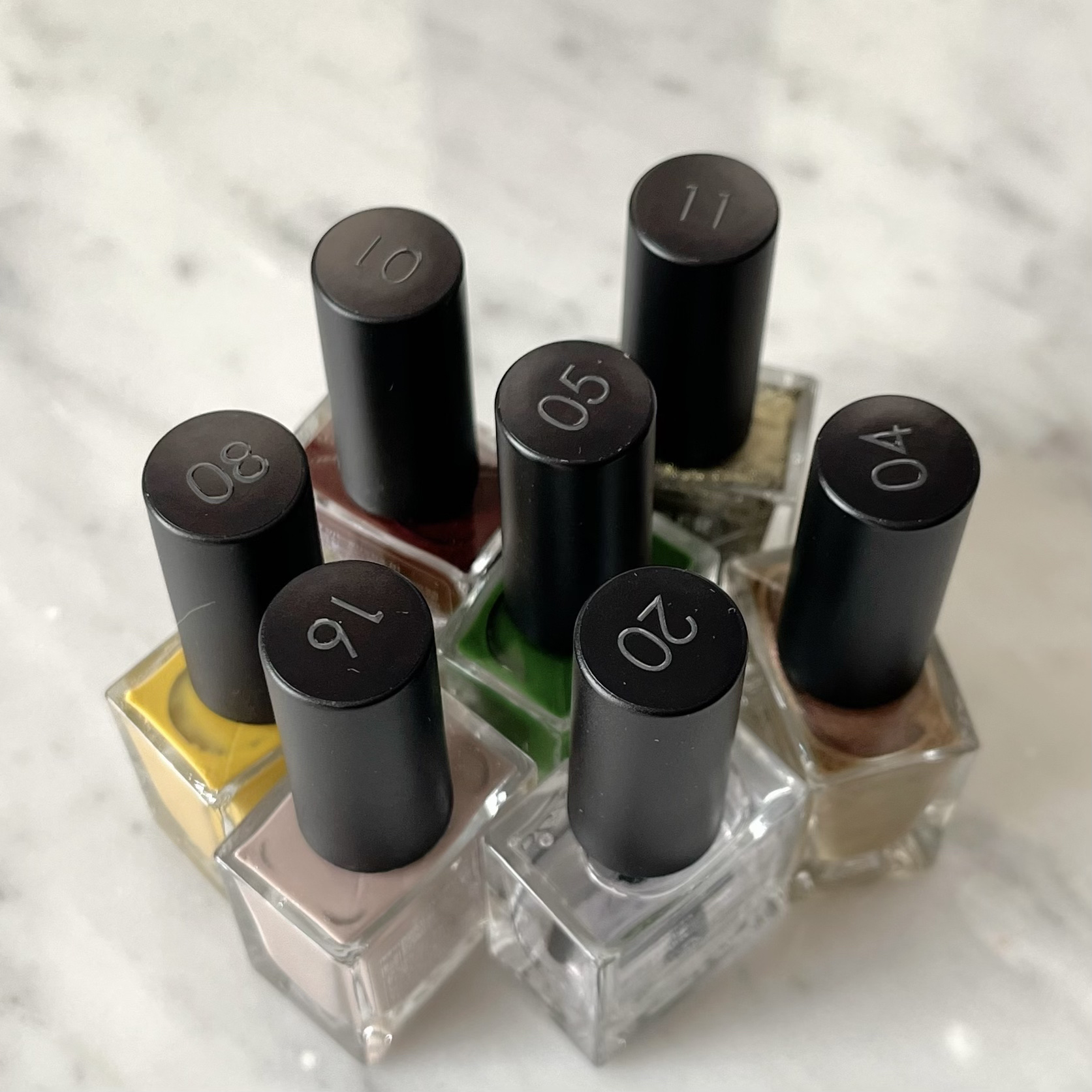 刷毛はスリムで束感があります。 とても速乾です✨ 色によって1度塗りだと、シアーだったりムラになりやすいものがあるので、好みで1〜2度塗りするといいかも🥰 09ユニコーンパール 11ロゼスパークル