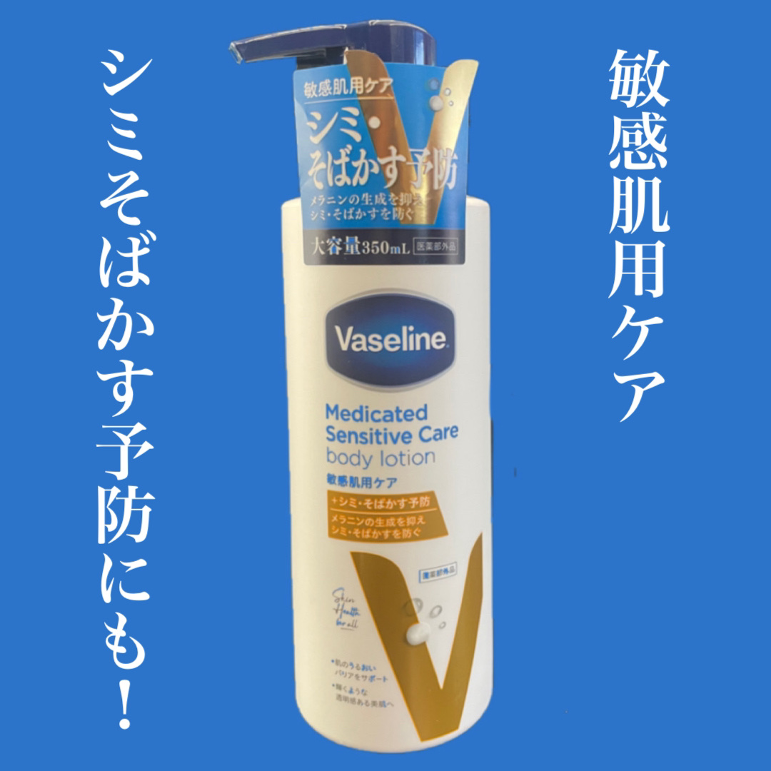 【使った商品】ヴァセリンメディケイティッドセンシティブケアボディローション美肌ケア【商品の特徴】敏感肌の為の薬用ボディローションプラセンタとニコチン酸アミドで穏やかな美白効果が期待できそう保湿成分も3種のヒアルロン酸と3種のセラミド配合で頼も...