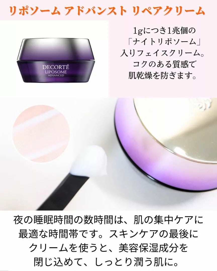 睡眠不足でも、3時間多く眠ったような肌へ。 なんて素敵なキャッチコピー♡ 1gのクリームに1兆個のナイトカプセルが肌をかけめぐりながら美を放ち肌の可能性を引き出すまさしく進化系ナイトクリーム💎 保湿力がすごく高いのに重くない! 伸びも肌馴染みも良いテクスチャもお気に入りー🩷