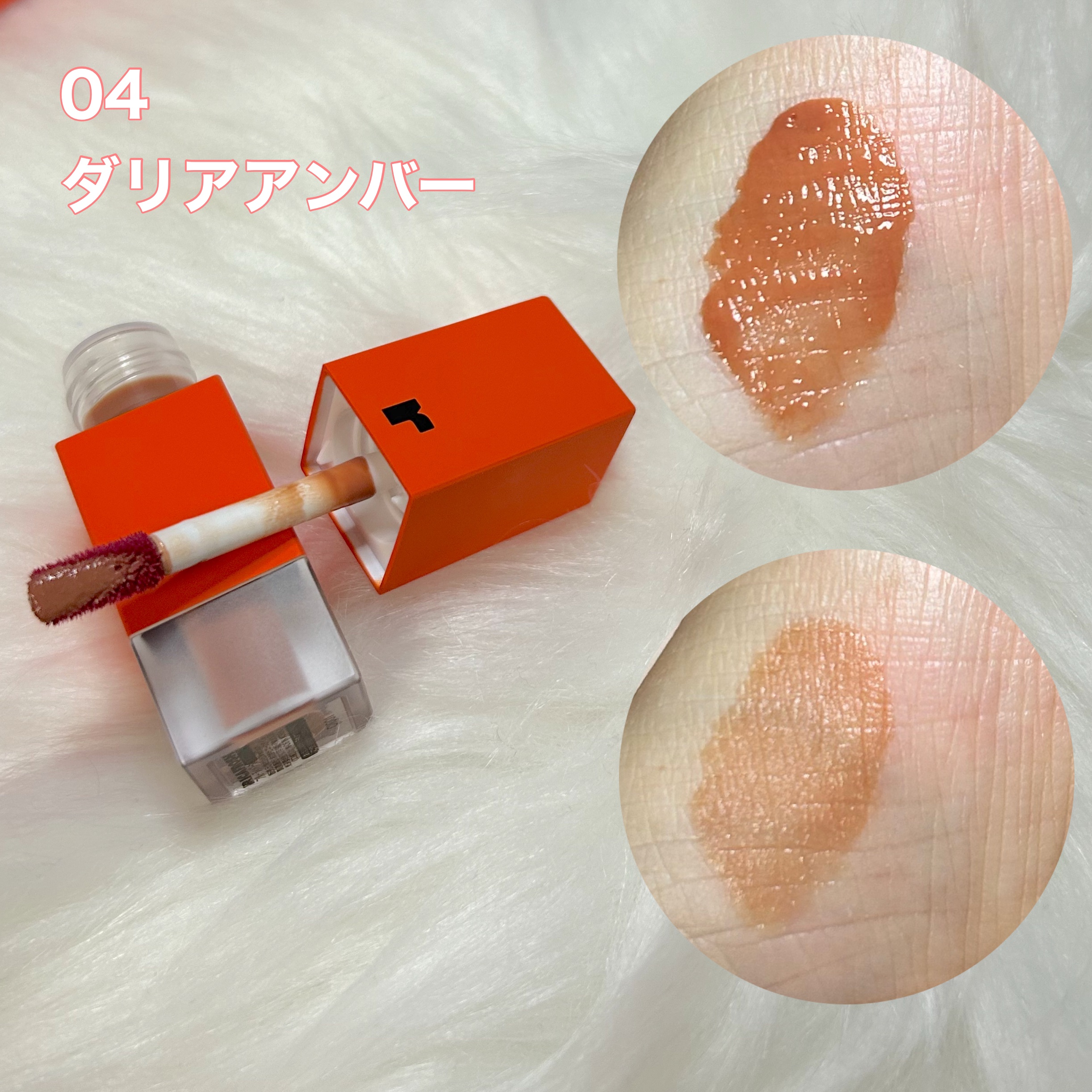 うるつやコーティングで色持ち・保湿24時間持続(臨床試験済み)なRICAFROSHのリップ。 使用したのは04番のDAHLIA AMBER(ダリアアンバー)、ほんのりとピンクをしのばせたスパイシーロゼブラウン。 さらっとしたテクスチャーで、香りはありませんが少し甘めの味がします。