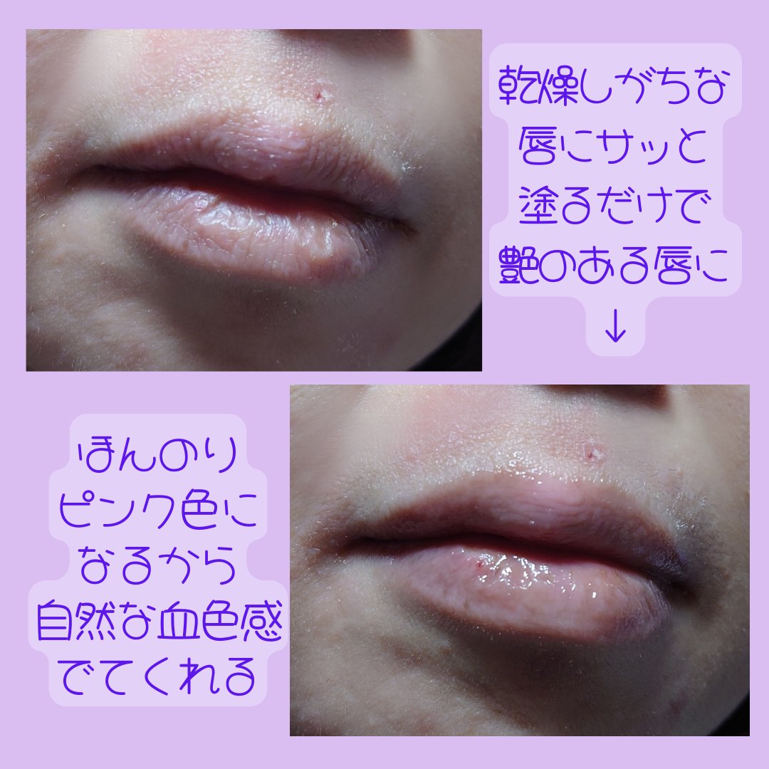 このパープルとイエローは、着色料ではなく、自然由来成分からの色だそうです。 香りも香料ではなく、使っている成分からの香りで、パープルはなんとなくほんのりとお花の香り、イエローは微かにシトラス系の香りがします。 一応パープルはデイリーケア用で、普段から頻繁に濡れてベタつかないテクスチャーです。 対してイエローはナイトケアにお勧めで、唇が柔らかくなるようにケアしてくれるそうです。 リップマスクの代わりに使って、唇に栄養を与えてくれて、朝に浮いた角質を優しく落とすと、なめらかな唇にしてくれるそうです。