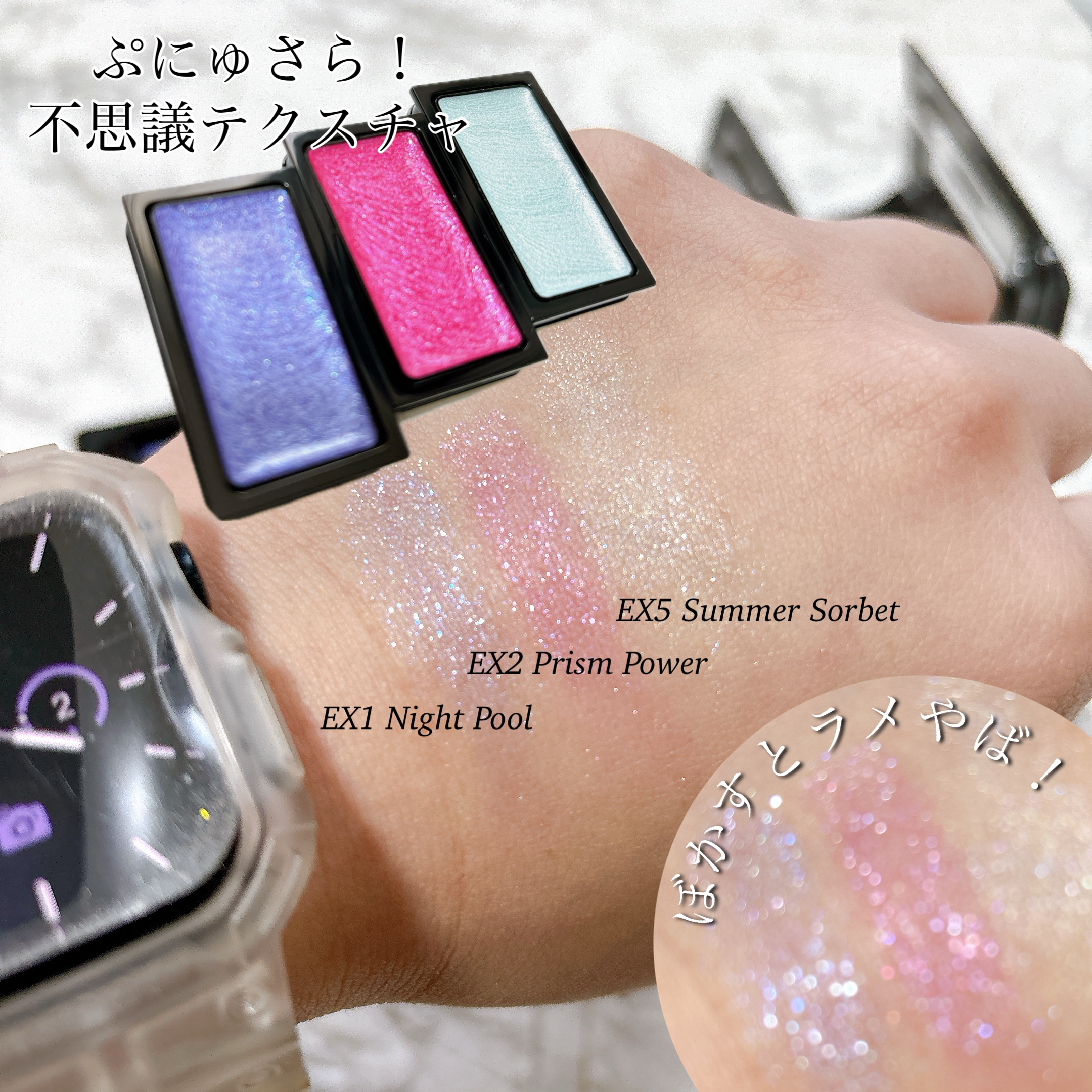 うるっと濡れツヤ✨アイカラー ちゅるちゅる不思議なみずみずしい触り心地で冬の日差しをきらきら反射するよ EX1 Night Pool は青みを吸う私の肌でもグレーっぽくならず、ブルーに発色する EX5 Summer Sorbet が人気で発売してすぐ品切れになってたんだけど年明けに公式オンライン見たら復活してたのでポチッた!
