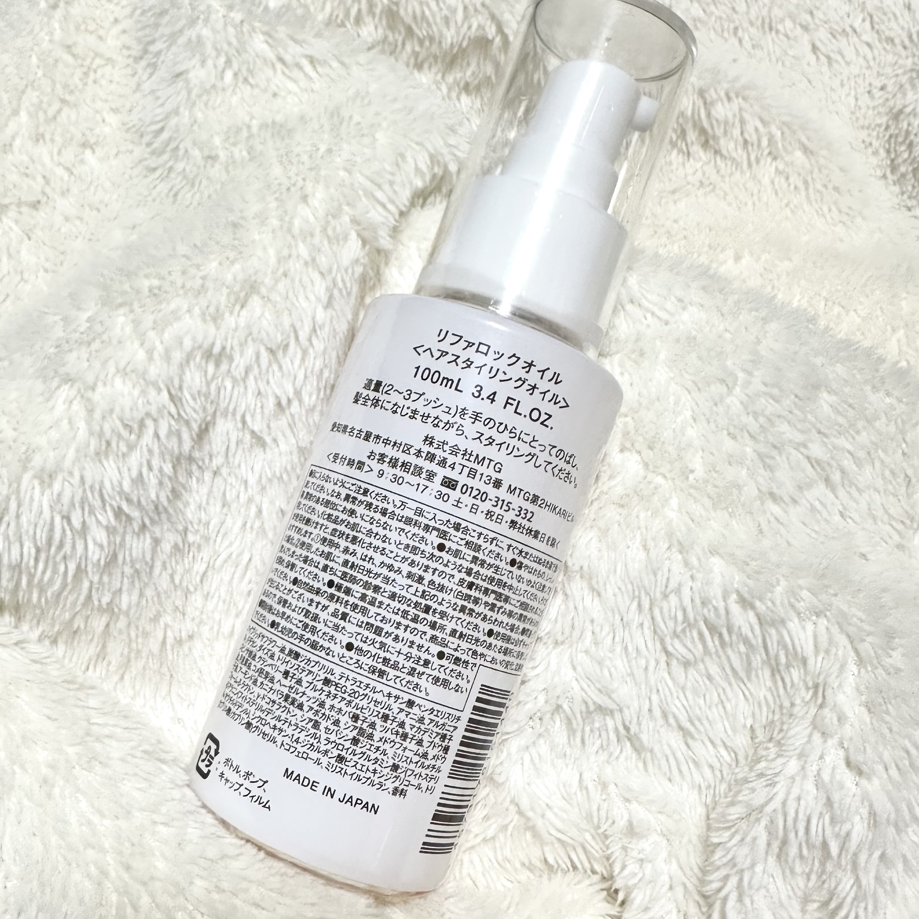 - 熱を味方にしなやかにロックし、ツヤめくスタイルがつづくオイル。 スタイリングの悩みに、アイロン前のワンステップ。 プロフェッショナルの熱コントロールに着想を得たメーカー独自の処方で、カールもストレートも、時間がたっても狙い通りのスタイルをロック。 髪表面を固めないので、驚くほどしなやかな指どおりとツヤを叶えます。 商品名 ReFa LOCK OIL リファロックオイル 品番 RC-AJ00A(リファロックオイル) 内容量 100mL ・本品は、日本国内にて、企画、開発を行っています。 ・「ReFa」は、(株) MTGの登録商標です。 2023年10月18日より新パッケージを発売/現行品取り扱い市場にて、随時切替