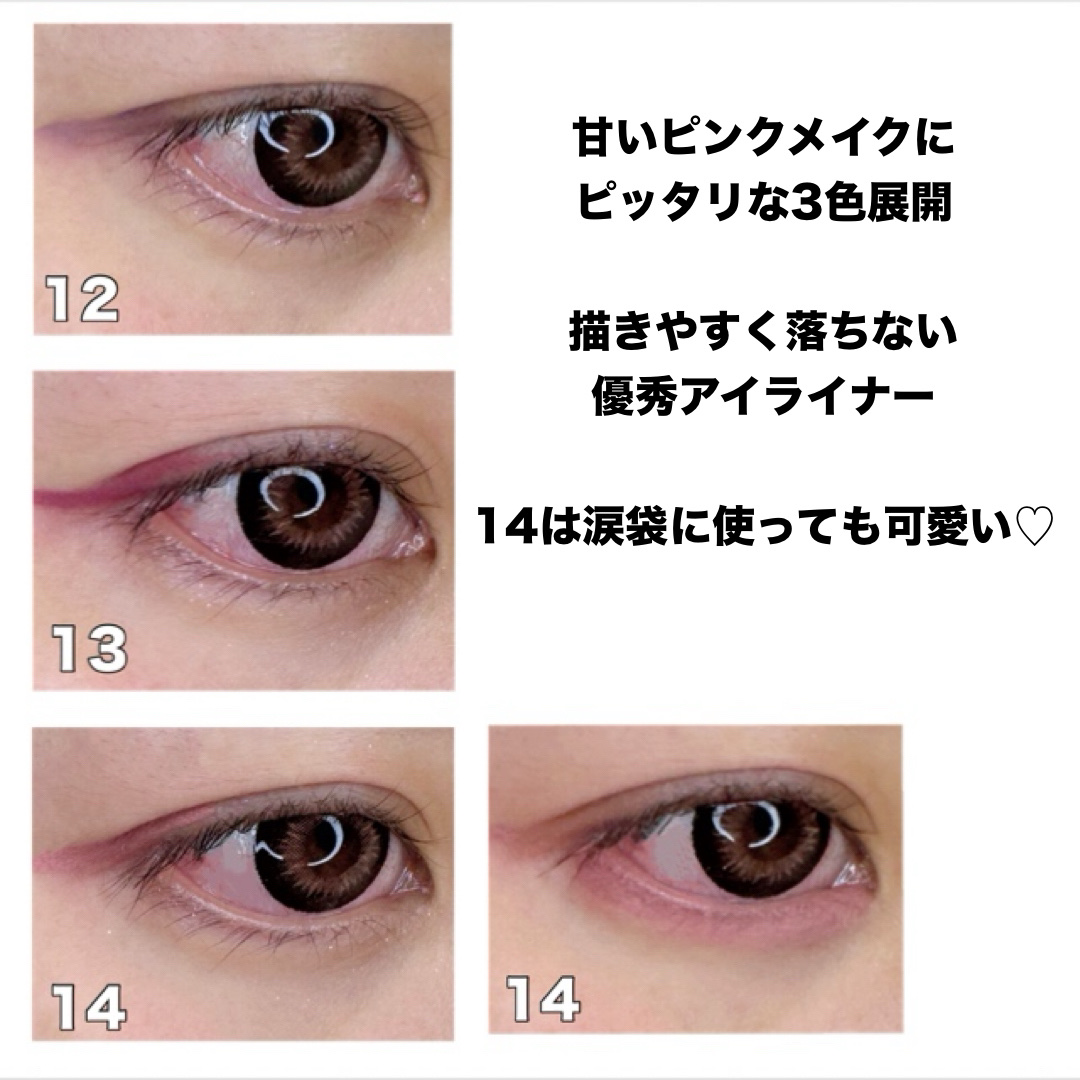 クリーミータッチライナー 12イチゴストーム モーヴ系ピンク。 13ブラッドイチゴ 可愛らしいいちごピンク。 14イチゴキューピッド 薄ピンクで実は涙袋に使用すると可愛いんです!!