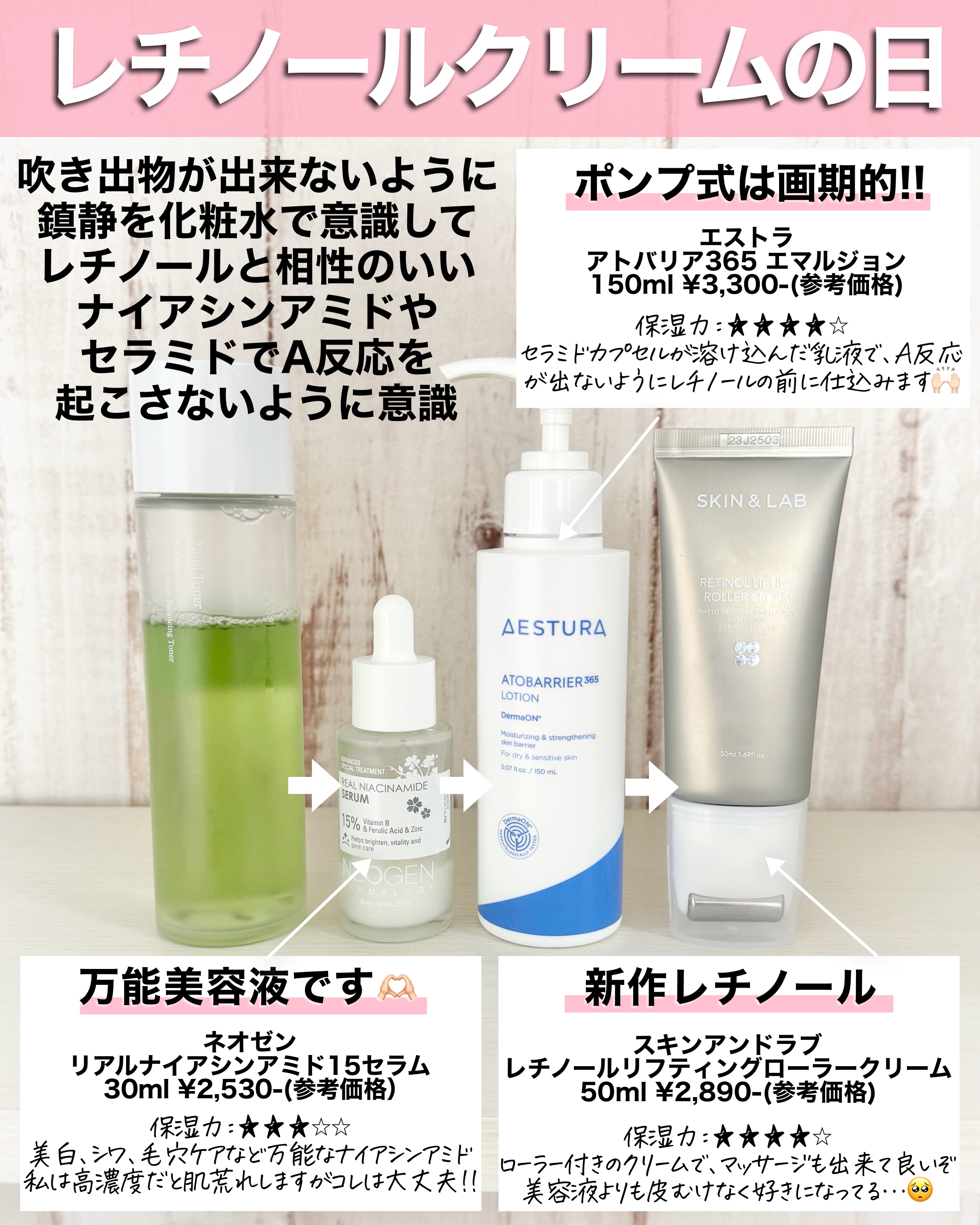ビタミンCとレチノール…併用したい… 結論、併用で一番オススメなのは 化粧水をビタミンCにする。 ビタミンCとレチノールを併用 しなくてはならないわけではないので。