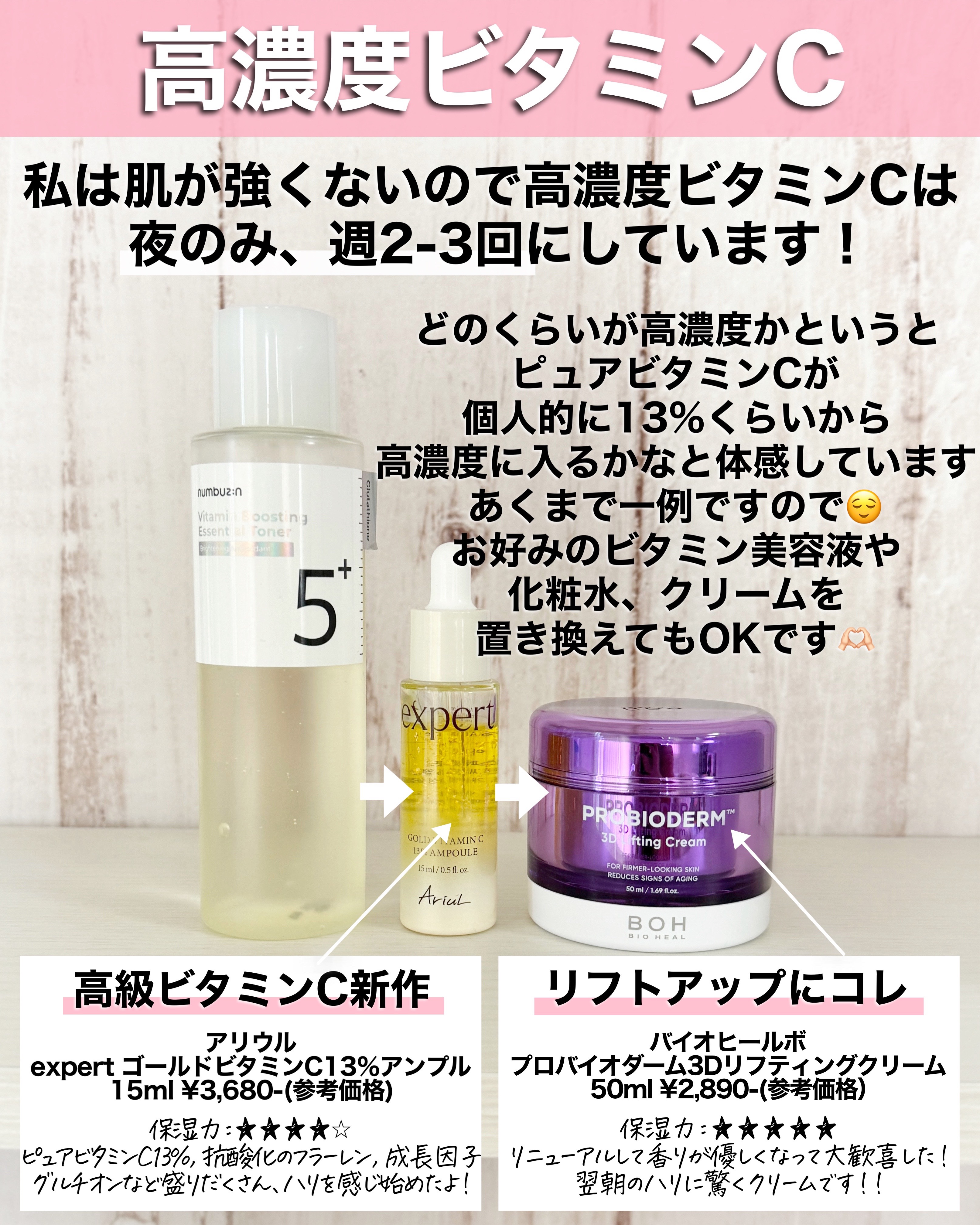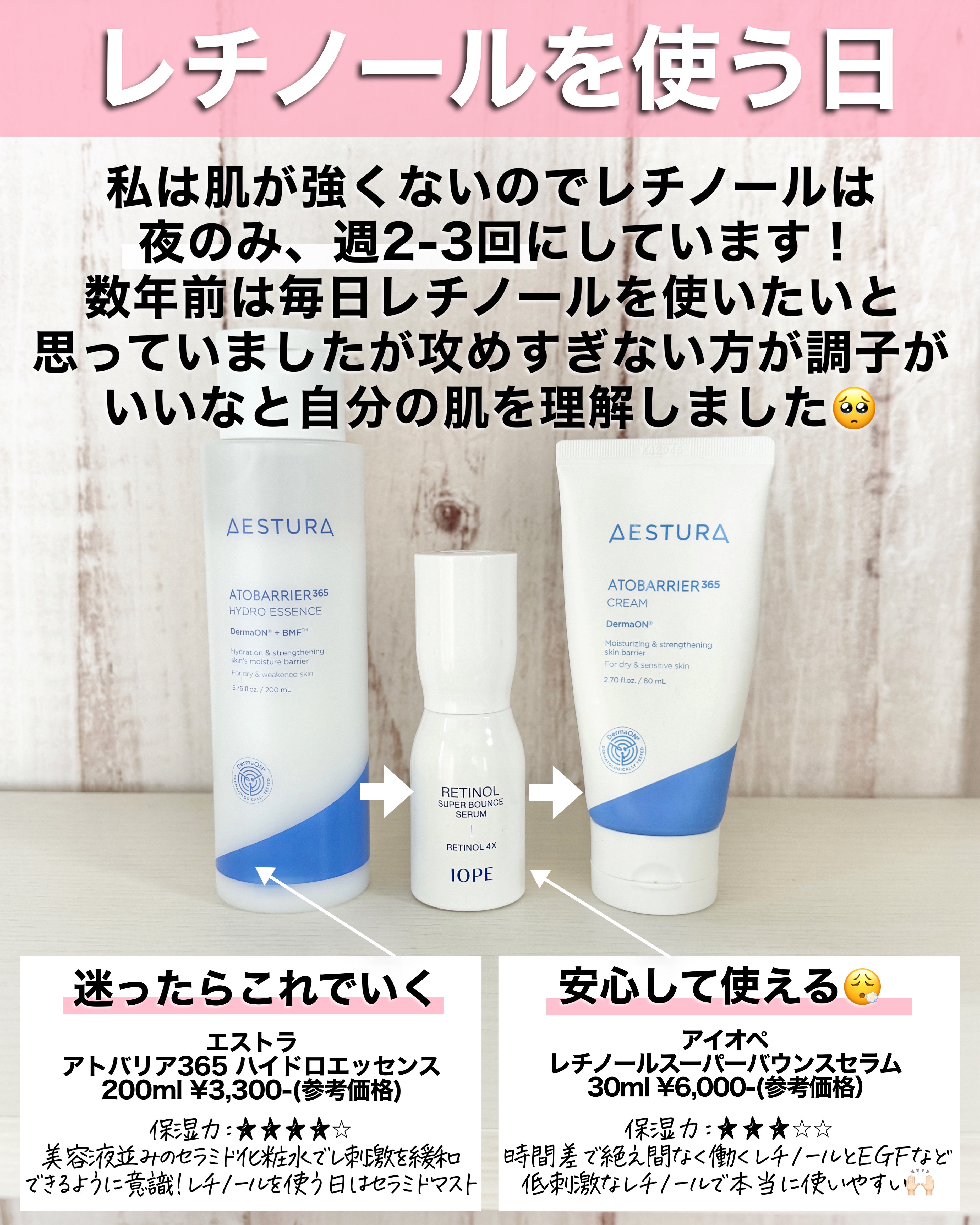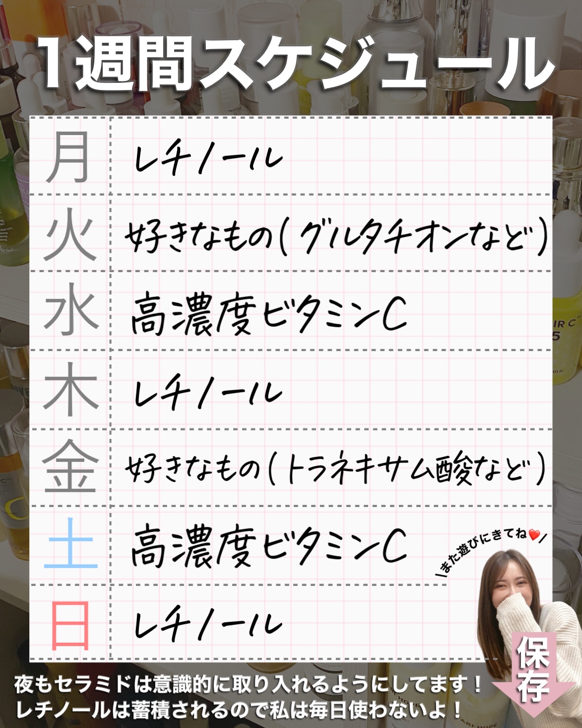 流行ってるから買うんじゃなくて、成分でアイテムを選べるようになりたい…!🥹 成分同士の相性を知ってると一気にスキンケア上級者になれる気がする💪 レチノールは紫外線によって不安定になりやすいのと、ビタミンCは紫外線とかのダメージから肌を守る効果があるから朝ビタミンCを使って夜レチノールを使うのがおすすめ!🙆♀️