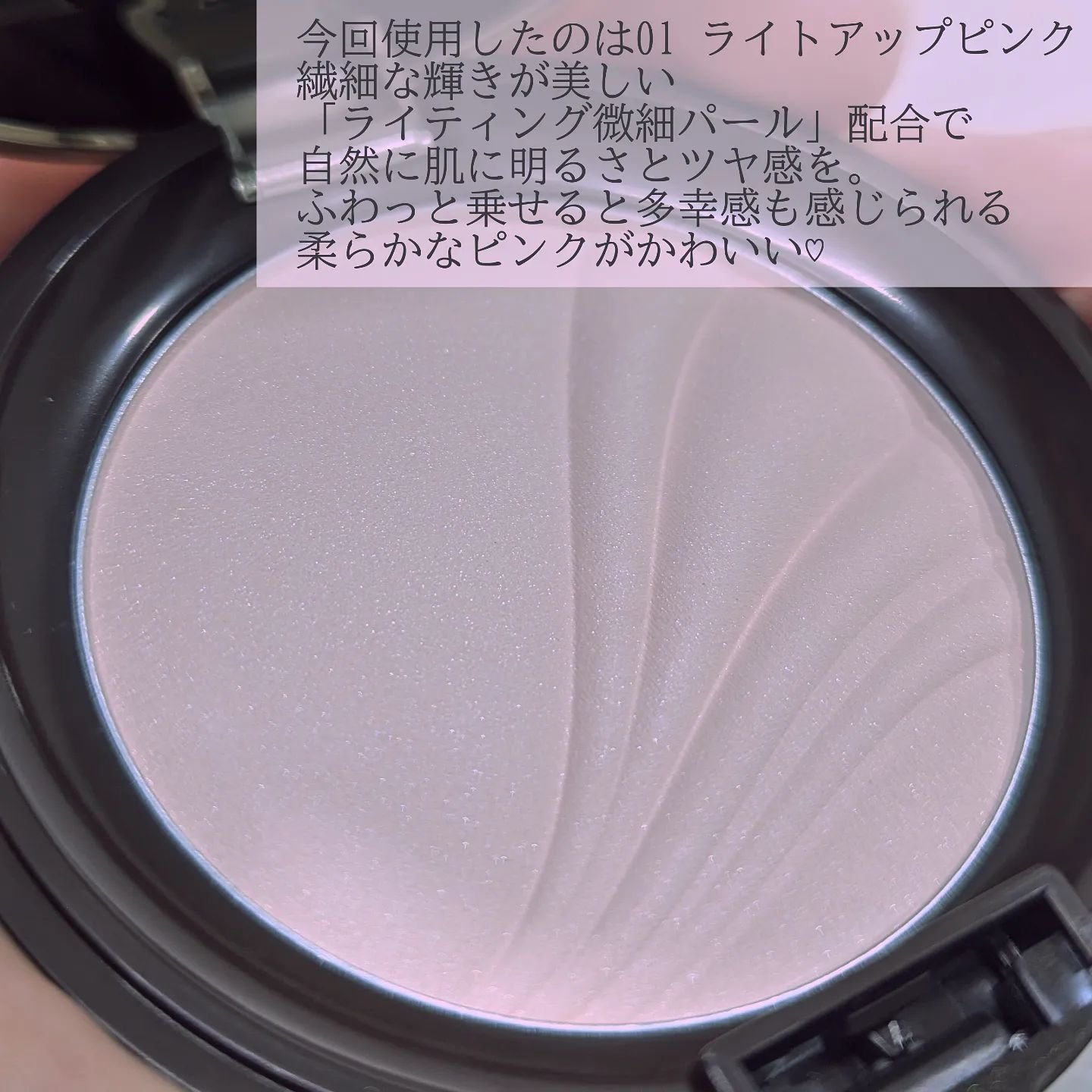 光が一番ほしい頬や鼻筋に、まるでスポットライトがあたったかのような明るさとツヤを実現。 若々しい印象の肌に仕上げる、新感覚の「3Dおしろい」。 澄んだ仕上がりの“ライティング微細パール”を高配合することで、頬や鼻筋など顔の高い部位は明るく、輪郭部分は肌になじんで見えて自然なメリハリ感を叶え、若々しさ溢れる肌印象へ。 02 ライトアップベージュは肌なじみのよいカラーで、さりげない華やかさをプラス…白浮きせず肌になじみやすいカラーで使いやすくてとても気に入っています!
