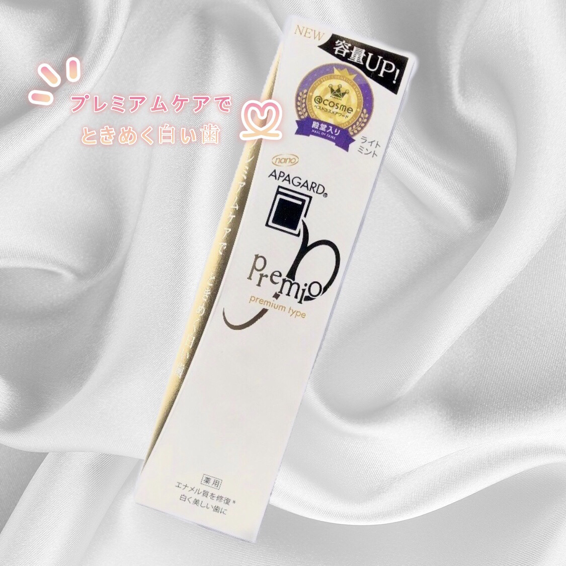- 【医薬部外品】 独自成分「薬用ハイドロキシアパタイト」がエナメル質を整えてむし歯を予防。アパガードはエナメル質の健康を保つことで自然な白い歯に導く美白歯みがきブランド。アパガードプレミオは「薬用ハイドロキシアパタイト」を高配合(スタンダードタイプ比)。プレミアムケアでときめく白い歯に。 <ライトミント> ●サンギ独自の薬用成分ナノ粒子「薬用ハイドロキシアパタイト」を高配合したプレミアムタイプ。※Mプラス、スモーキン比 ●歯の再石灰化率、白色度もアップ。 ●歯垢を吸着除去し、歯のエナメル質の目に見えない傷を埋め、ミネラル欠損部(初期むし歯)を再石灰化するナノ<mHAP>の3つの働きで、むし歯を予防。 ●パール成分(加水分解コンキオリン液)配合。 <エクストラミント> ●強めのミントがお好みの方におススメ!ミント強めの「エクストラミント」フレーバー。 ●サンギ独自の薬用成分ナノ粒子「薬用ハイドロキシアパタイト」を高配合したプレミアムタイプ。※Mプラス、スモーキン比 ●歯垢を吸着除去、エナメル質表面の目に見えない傷を埋めてなめらかに、エナメル質から溶け出したミネラルを補給(再石灰化)する、という薬用ハイドロキシアパタイトの3つの作用でむし歯を予防。 ●パール成分(加水分解コンキオリン液)を追加したブライトニング処方