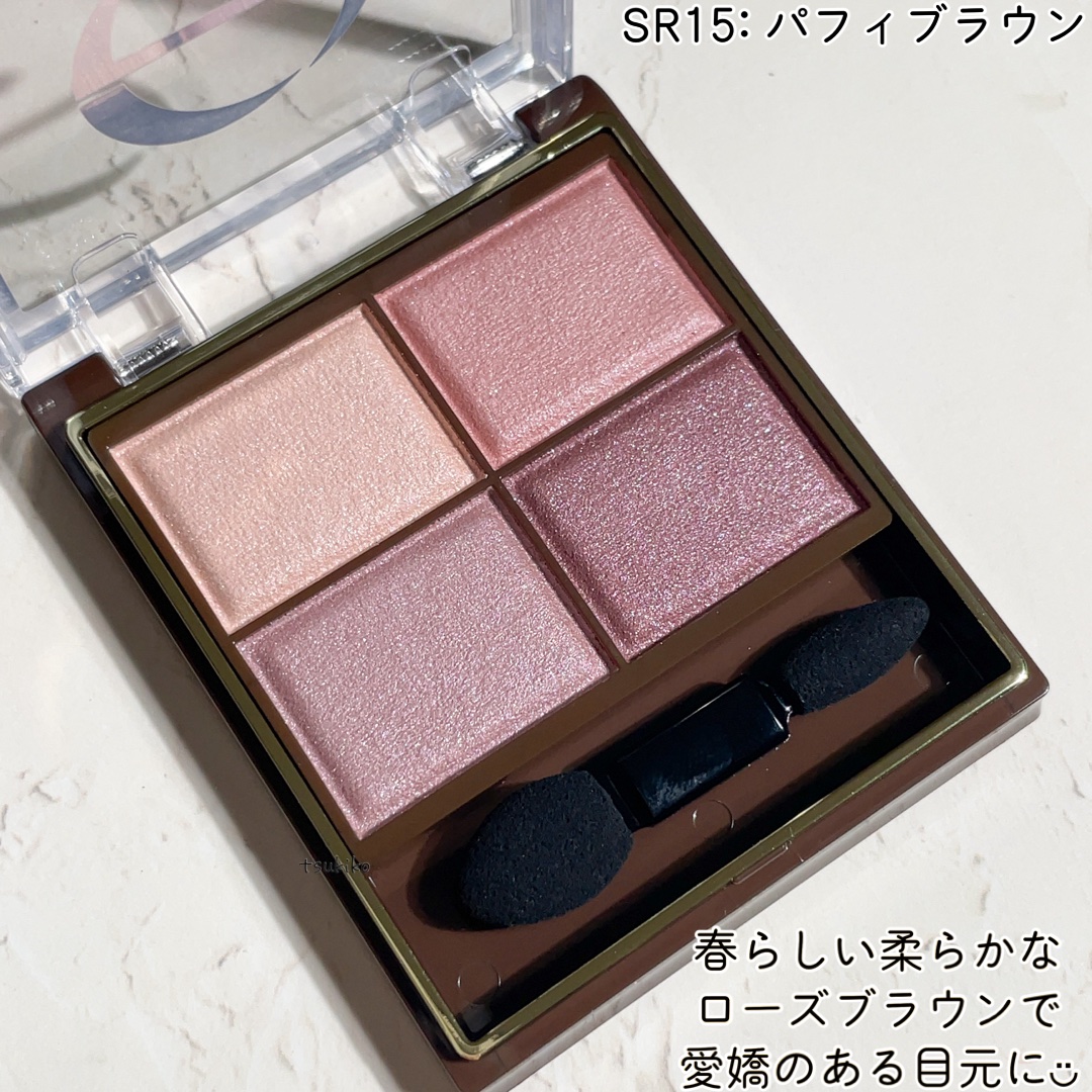 - 【ポイント】 1.失敗しらずのブラウンベースの4色パレット!簡単にグラデーションを実現。 2.しっとりリッチな質感!するする伸びて粉飛びもなく目元の乾燥も防ぎます。 3.上品な輝きの繊維パール+金パールを贅沢に配合。ギラつかない大人のツヤを演出。 <SR01'23・SR03'23・SR06'23・SR11'23(限定デザイン)> 実力派グラデアイシャドウからデジタルアートをあしらった限定デザイン登場。 しっとりリッチな密着感。肌のなじみの良い実力派グラデアイシャドウ。