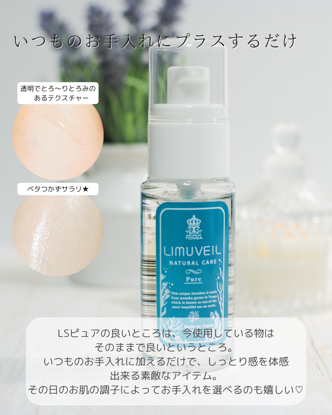 お肌と髪両方に使える美容液♡LIMUVEILLSピュア商品に含まれる「フコイダン」は潤いとその持続性が大きな特徴となります!その効果はヒアルロン酸よりも高いと検証されています!フコダインとは…?海藻のぬるぬるに含まれるものです。こ...