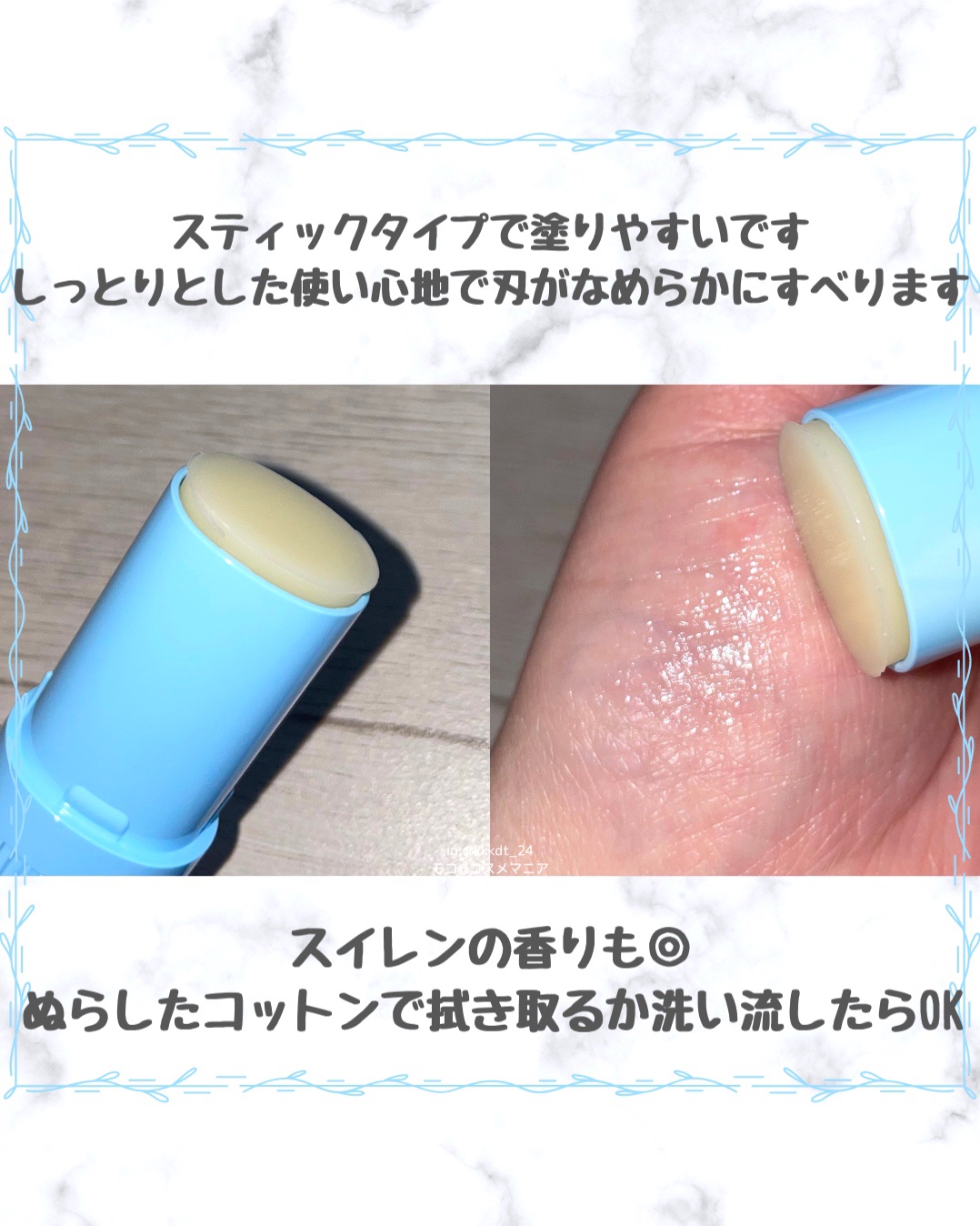 初めてシェービング剤を使う人にも使いやすいように手が汚れない史上初のスティックタイプのシェービングバーム✨ するする体温でとろけてなめらか!しっとりオイルっぽい保湿力が高くて乾きづらい! うぶ毛処理後、肌の明るくみえる!メイクのり、スキンケアの入りも良かったです!