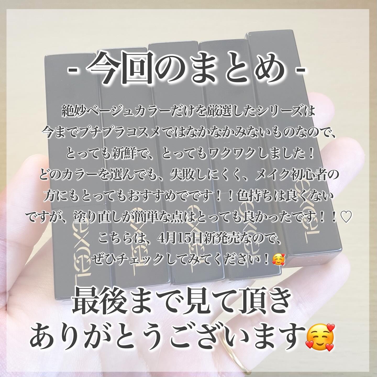 | 口紅・グロス・リップライナーランキング第141位 | するするっとぬれる質感と透け感のある発色で、全部のカラーにほんのりベージュのニュアンスがあるから肌なじみが良い! | 詳細を見る |