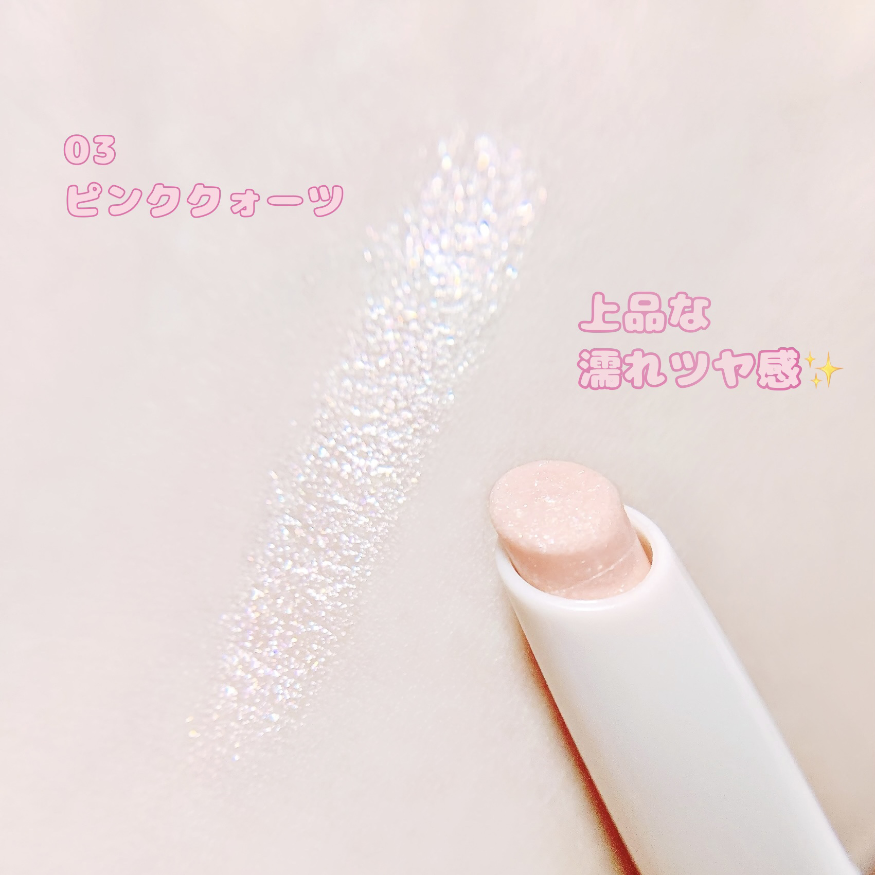 輝度感高めのラメがザクザク入ったスティックアイシャドウ 底色はほとんど出ないのでどんなメイクとも相性抜群◎ 塗布してすぐ指で馴染ませるとダマなく綺麗に仕上がり、密着力も上がります。
