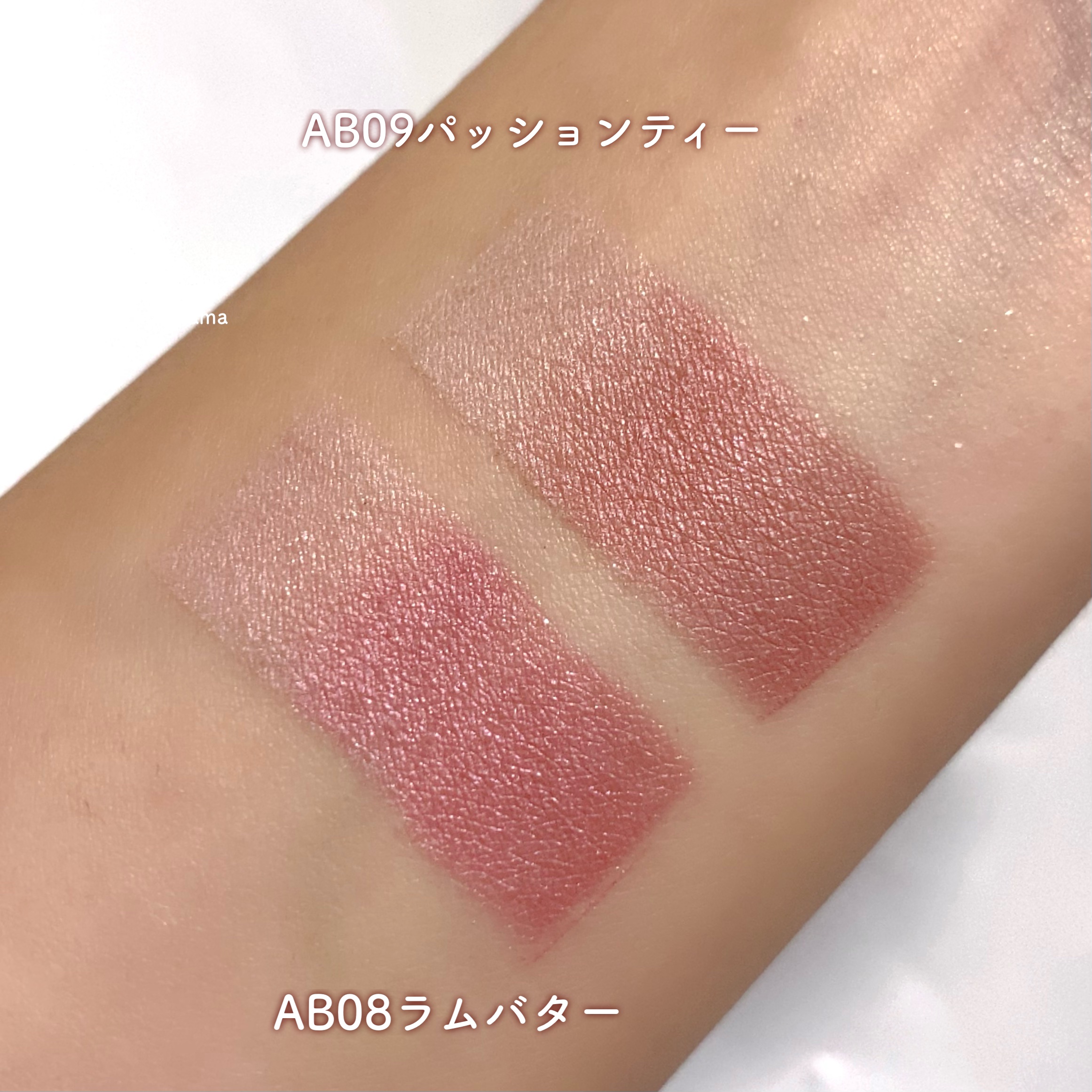 - <AB01-AB05共通> タルク、 ミリスチン酸亜鉛、 ジメチコン、 ジフェニルシロキシフェニルトリメチコン、 ワセリン、 セラミドNP、 スクワラン、 ホホバ種子油、 ブドウ種子油、 シリカ、 セスキイソステアリン酸ソルビタン、 トコフェロール、 水酸化Al、 フェノキシエタノール、 (+/-) グンジョウ、 マイカ、 黄4、 酸化チタン、 酸化鉄、 赤202、 赤226 <AB06-AB07> タルク、ミリスチン酸亜鉛、ジメチコン、ジフェニルシロキシフェニルトリメチコン、ワセリン、セラミドNP、スクワラン、ホホバ種子油、ブドウ種子油、シリカ、セスキイソステアリン酸ソルビタン、トコフェロール、水酸化Al、フェノキシエタノール、(+/-)グンジョウ、マイカ、酸化チタン、酸化鉄、赤226 <AB08-AB09> タルク、ミリスチン酸亜鉛、ジメチコン、ジフェニルシロキシフェニルトリメチコン、ワセリン、セラミドNP、スクワラン、ホホバ種子油、ブドウ種子油、シリカ、セスキイソステアリン酸ソルビタン、トコフェロール、水酸化Al、フェノキシエタノール、グンジョウ、マイカ、酸化チタン、酸化鉄、赤226、硫酸Ba