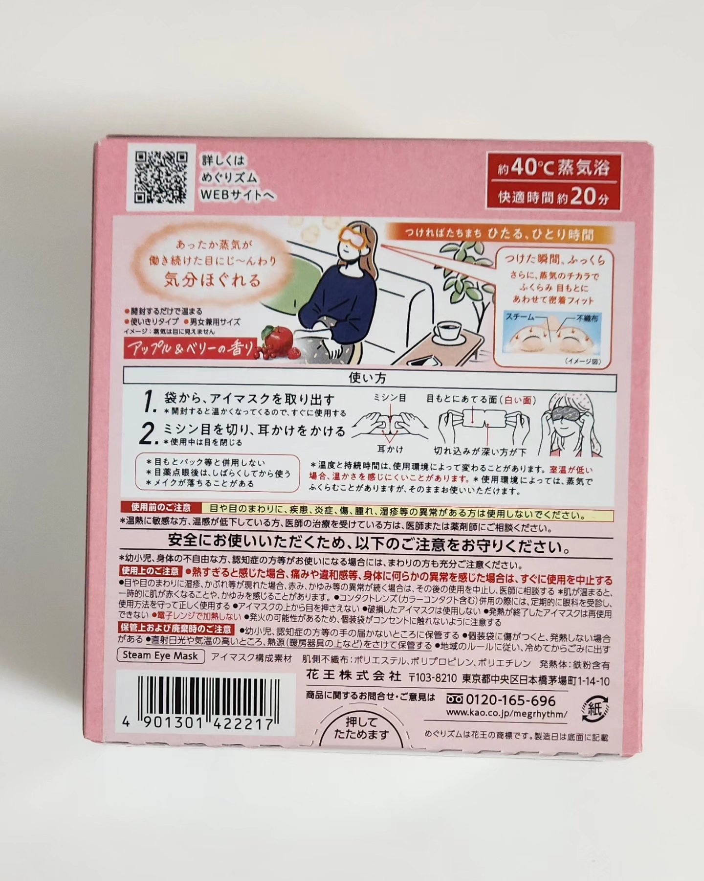 - 【数量限定】 心地よい蒸気が働き続けた目と目元を温かく包み込み、リラックスタイムをサポートするアイマスク。 まるでお風呂のような心地よさ。快適温度約40℃、快適時間約20分。 一日の緊張感から解き放たれ、気分まで奥からじんわりほぐれていきます。 つけた瞬間ふっくら。さらに蒸気のチカラでふくらみ、目元にあわせて密着フィット。 つければたちまち、ひたるひとり時間。 アップル&ベリーの香り