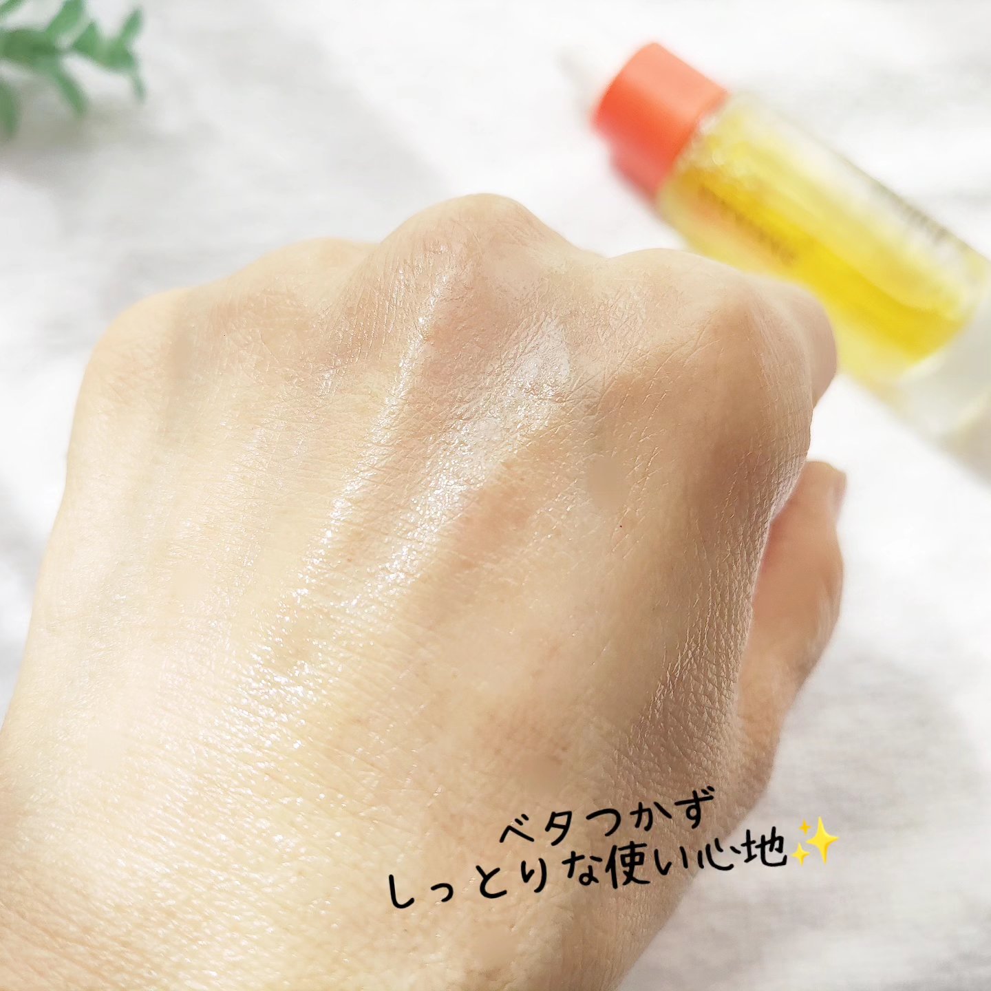 しっとりな使い心地がうれしい💛 高級感のあるガラスボトルがとっても素敵です! オイル層とローション層に分かれてるのでまずはよ~く振ってから使ってね。 オイルが入っているとは思えないようなサラッとしたテクスチャー✨ なじませると、みずみずしく しっとりとした使い心地です🤍 肌にほどよいツヤ感が出るので、ツヤ肌メイク好きの方にも向いている思う! 9つのフリー処方なのも、ゆらぎ肌にはうれしい処方だよね。