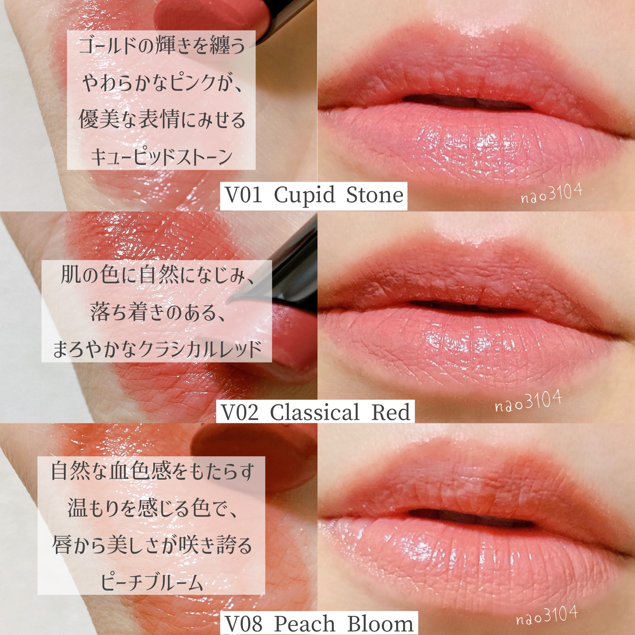 - <EX3 Cranberry Drop> 水添ポリイソブテン、ラウロイルグルタミン酸ジ(フィトステリル/オクチルドデシル)、トリ(カプリル酸/カプリン酸)グリセリル、ラウロイルグルタミン酸ジ(オクチルドデシル/フィトステリル/ベヘニル)、イソノナン酸イソトリデシル、ダイマージリノール酸(フィトステリル/イソステアリル/セチル/ステアリル/ベヘニル)、パラフィン、ポリエチレン、オクチルドデカノール、マイクロクリスタリンワックス、水添マイクロクリスタリンワックス、パルミトイルヒドロキシプロピルセルロース、ヒドロキシステアリン酸エチルヘキシル、トコフェロール、トリポリヒドロキシステアリン酸ジペンタエリスリチル、デカイソステアリン酸ポリグリセリル- 10、マカデミア種子油、マカデミアナッツ脂肪酸フィトステリル、アンズ核油、カニナバラ果実油、(エチレン/プロピレン)コポリマー、ジメチコン、ダイズ油、クエン酸、ニンジン根エキス、(+/-)(チタン/酸化チタン)焼結物、グンジョウ、セルロース、パルミチン酸、マイカ、ラウロイルアスパラギン酸Na、ラウロイルリシン、塩化亜鉛、酸化チタン、酸化鉄、水酸化Al、硫酸Ba、トリイソステアリン酸イソプロピルチタン、合成フルオロフロゴパイト、黄4、赤104(1)、赤201、赤202、赤223 <EX4 Guava Punch> 水添ポリイソブテン、ラウロイルグルタミン酸ジ(フィトステリル/オクチルドデシル)、トリ(カプリル酸/カプリン酸)グリセリル、ラウロイルグルタミン酸ジ(オクチルドデシル/フィトステリル/ベヘニル)、イソノナン酸イソトリデシル、ダイマージリノール酸(フィトステリル/イソステアリル/セチル/ステアリル/ベヘニル)、パラフィン、ポリエチレン、オクチルドデカノール、マイクロクリスタリンワックス、水添マイクロクリスタリンワックス、パルミトイルヒドロキシプロピルセルロース、ヒドロキシステアリン酸エチルヘキシル、トコフェロール、トリポリヒドロキシステアリン酸ジペンタエリスリチル、デカイソステアリン酸ポリグリセリル- 10、マカデミア種子油、マカデミアナッツ脂肪酸フィトステリル、アンズ核油、カニナバラ果実油、(エチレン/プロピレン)コポリマー、ジメチコン、ダイズ油、クエン酸、ニンジン根エキス、(+/-)(チタン/酸化チタン)焼結物、グンジョウ、セルロース、パルミチン酸、マイカ、ラウロイルアスパラギン酸Na、ラウロイルリシン、塩化亜鉛、酸化チタン、酸化鉄、水酸化Al、硫酸Ba、トリイソステアリン酸イソプロピルチタン、合成フルオロフロゴパイト、黄4、赤104(1)、赤201、赤202、赤223 <V01 Cupid Stone> 水添ポリイソブテン、ラウロイルグルタミン酸ジ(フィトステリル/オクチルドデシル)、トリ(カプリル酸/カプリン酸)グリセリル、ラウロイルグルタミン酸ジ(オクチルドデシル/フィトステリル/ベヘニル)、イソノナン酸イソトリデシル、ダイマージリノール酸(フィトステリル/イソステアリル/セチル/ステアリル/ベヘニル)、パラフィン、ポリエチレン、オクチルドデカノール、マイクロクリスタリンワックス、水添マイクロクリスタリンワックス、パルミトイルヒドロキシプロピルセルロース、ヒドロキシステアリン酸エチルヘキシル、トコフェロール、トリポリヒドロキシステアリン酸ジペンタエリスリチル、デカイソステアリン酸ポリグリセリル-10、マカデミア種子油、マカデミアナッツ脂肪酸フィトステリル、アンズ核油、カニナバラ果実油、(エチレン/プロピレン)コポリマー、ジメチコン、ダイズ油、クエン酸、ニンジン根エキス、(+/-)(チタン/酸化チタン)焼結物、グンジョウ、シリカ、セルロース、パルミチン酸、マイカ、ラウロイルアスパラギン酸Na、ラウロイルリシン、塩化亜鉛、酸化チタン、酸化鉄、水酸化Al、硫酸Ba、トリイソステアリン酸イソプロピルチタン、酸化スズ、ホウケイ酸(Ca/Al)、合成フルオロフロゴパイト、黄4、黄5、赤104(1)、赤201、赤202、赤223、橙201 <V02 Classical Red> 水添ポリイソブテン、ラウロイルグルタミン酸ジ(フィトステリル/オクチルドデシル)、トリ(カプリル酸/カプリン酸)グリセリル、ラウロイルグルタミン酸ジ(オクチルドデシル/フィトステリル/ベヘニル)、イソノナン酸イソトリデシル、ダイマージリノール酸(フィトステリル/イソステアリル/セチル/ステアリル/ベヘニル)、パラフィン、ポリエチレン、オクチルドデカノール、マイクロクリスタリンワックス、水添マイクロクリスタリンワックス、パルミトイルヒドロキシプロピルセルロース、ヒドロキシステアリン酸エチルヘキシル、トコフェロール、トリポリヒドロキシステアリン酸ジペンタエリスリチル、デカイソステアリン酸ポリグリセリル-10、マカデミア種子油、マカデミアナッツ脂肪酸フィトステリル、アンズ核油、カニナバラ果実油、(エチレン/プロピレン)コポリマー、ジメチコン、ダイズ油、クエン酸、ニンジン根エキス、(+/-)(チタン/酸化チタン)焼結物、グンジョウ、シリカ、セルロース、パルミチン酸、マイカ、ラウロイル