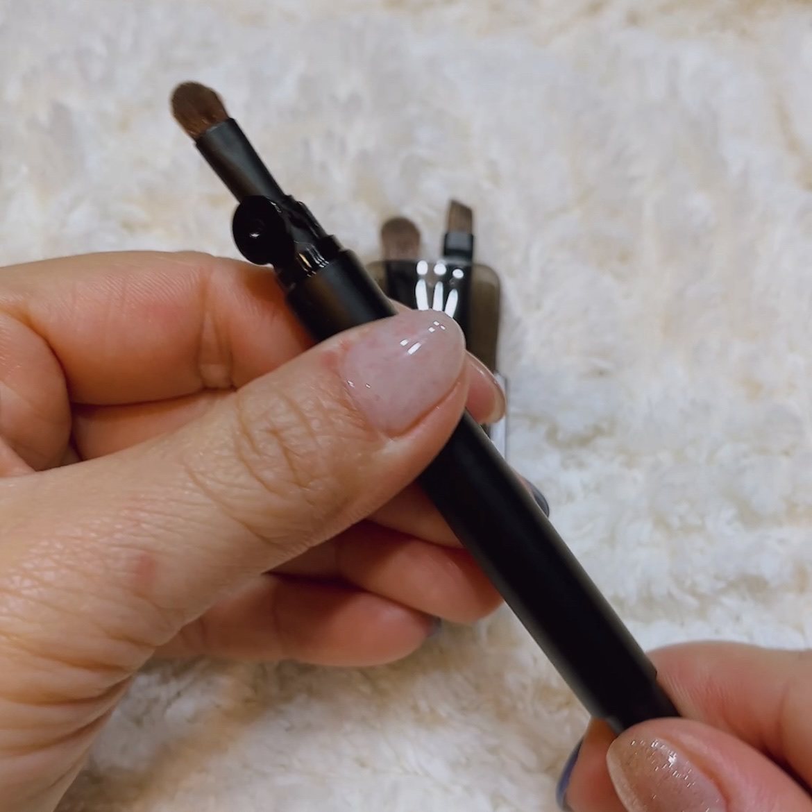 - 〈ブラシヘッドが交換可能〉 1本で3種のブラシヘッドが取り付け可能。いろいろなブラシヘッドを付け替えられるだけでなく、毛先を交換することで本体をより長くご使用いただくことができます。またブラシヘッドを取り外せることで、持ち運びにも便利。お手入れも簡単です。 〈キャップ、ポーチ付き〉 キャップ付きで毛先を収納できるため、ポーチの中も汚れる心配がありません。キャップで保護することで毛質の劣化も防ぎます。また外したブラシ先端部を保管できるポーチが付属しています。 〈スライド式なので片手で操作可能〉 ブラシ本体はスライド式のキャップ付きで、持ち運びや保管がしやすくなっています。ブラシをスライドするだけでキャップを開けることができ、片手で扱える操作性のよさにもこだわりました。 =============== ◆セット内容 ・アイシャドウブラシ シャドウをぼかすなど広い面に使える実力派ブラシ ・ポイントシャドウブラシ 目頭や目尻などの細部の陰影づくりに ・アイブロウブラシ 毛先が斜めにカッティングされ眉を整えるときに ・ブラシ保管用ポーチ ===============