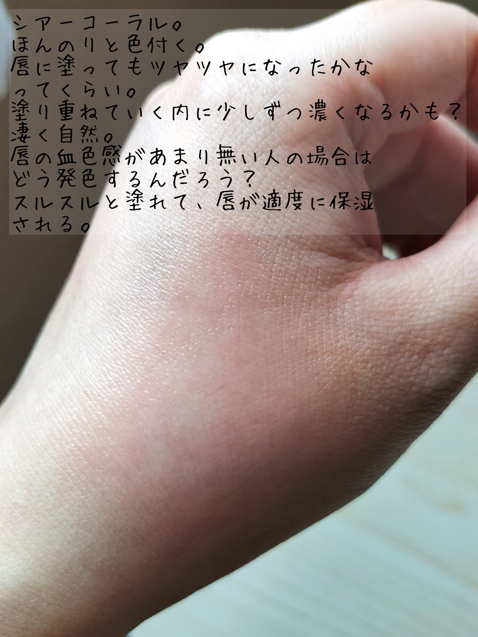どちらも粘膜に近い色だから、落ちても汚く見えなくて好き。 ジェル膜処方のリップってティントリップよりも落としやすいのも好き。 意外と似てた。手に塗った時は結構違って見えたんだけどね。