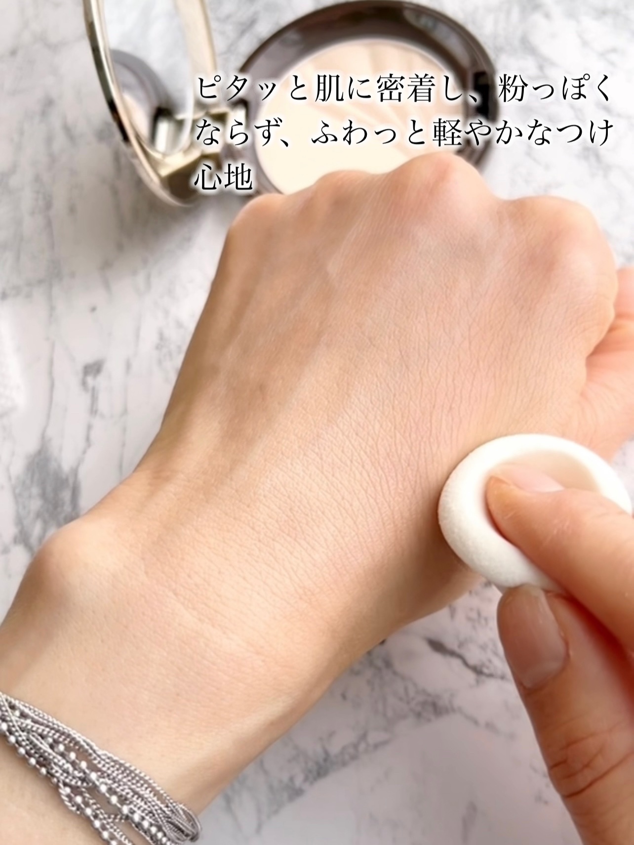- 1.3色の<ライティング微細パール>高配合 繊細かつクリアなパール<ライティング微細パール>を採用することで、不自然にぎらつくことなくパール剤を高配合でき、明るく澄んだ仕上がりを実現。顔の高い部分を明るく見せ、明暗差を作り出します。さらに、赤、青、白の3色のパール剤をブレンド。肌から浮かずに馴染み、色相もコントロールして透明感とメリハリのある仕上がりを叶えます。 ◎スポットライトを浴びたような明るさ 鼻筋や頬など、顔の高い部位に光を放ち、スポットライトを浴びたような明るさを実現。若々しい印象を作ります。 ◎肌に溶け込むようになじみ、くすみを払拭。際立つ透明感 3色を最適な配合比で組み合わせることにより、明暗差だけでなく、色相差もコントロール。 頬や、鼻筋など顔の高いパーツは明るさが高まり、側面は肌になじんで見えるため、白浮き感のない仕上がりです。新色のライトアップベージュは、青のパールの配合比にこだわり、肌なじみの良さを生かしながら、明るさと透明感を最大限際立たせたカラーです。 2.<エアリースプレッド製法>により、均一な塗膜を形成 空気を均一に含み、粉体が整列した状態でパウダーを成型する<エアリースプレッド製法>を採用。 均一に整列した粉体がそのまま肌に塗布できるため、フィルムのように面となって広がり、均一な塗膜を形成し、肌にぴたりと密着。専用スポンジで塗布することで、さらにきれいに光を反射しやすくなります。 3.<ブライトキープパウダー>が粉体を密着させ、肌の明るさが続く 粉体を均一に塗布した後、肌にしっかり密着させる パールが密着して、はがれにくい<ブライトキープパウダー>を配合。肌の乾燥を感じさせず、さらさらとした心地よい仕上がりと化粧持ちを実現。1日中、明るくいきいきとした肌が続きます。