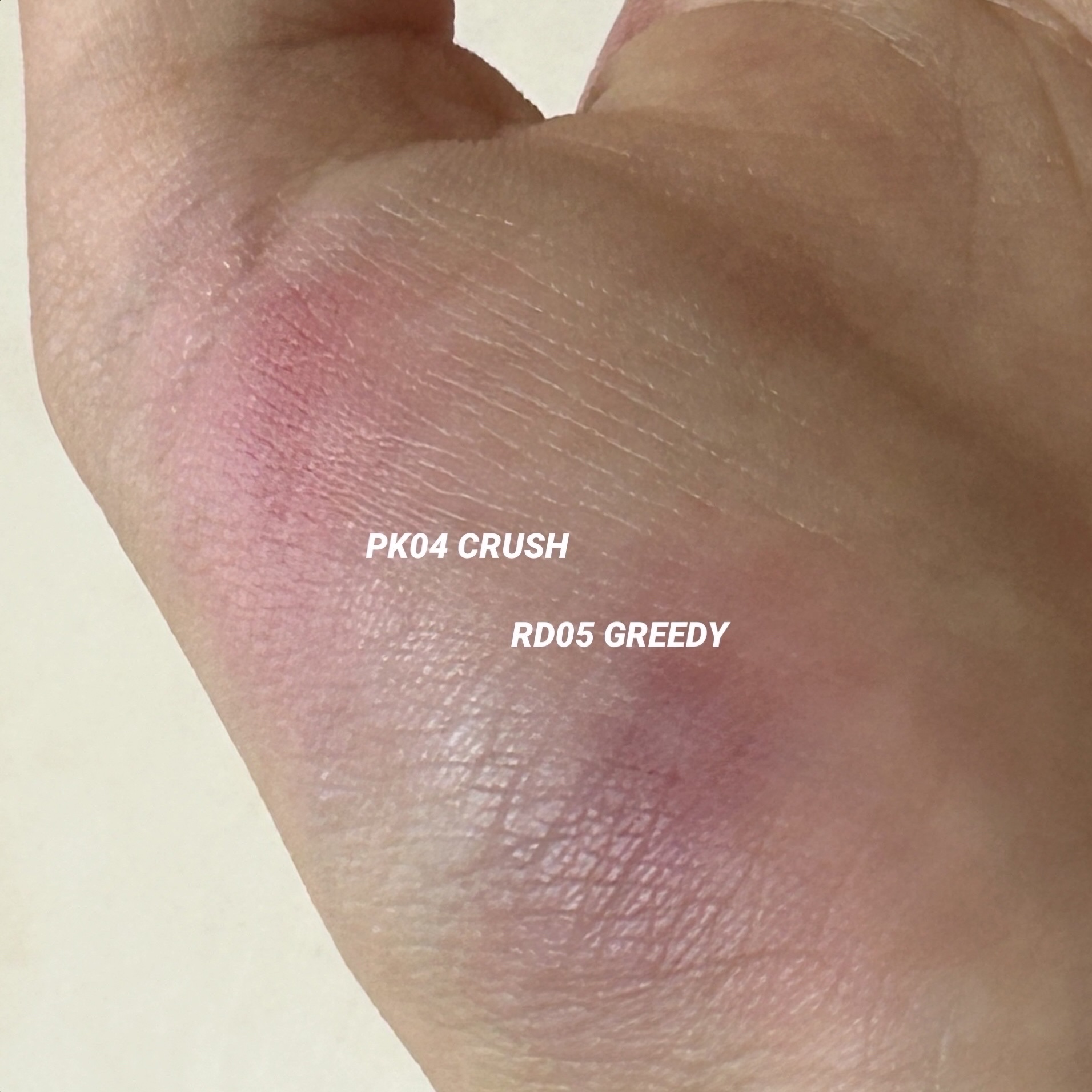 PK04 クラッシュは ザ・青み系ピンク パキッとしたカラーながらも、柔らかさを感じるので 薄く塗ればリップのベースとして、また もちろんこのカラーをメインにして塗ったりもできるので、ブルベの方、青み系カラーが欲しい方、また挑戦してみたい方には特におすすめしたいです。 RD05 グリーディは ワインレッド系カラー レッドも感じるし、パープルも感じる!深みのある色が得意な方、好きな方におすすめです。とても大人っぽいカラー。濃く、深みのある色なので、個人的にリップで使う場合は メインカラーとして使うことが多くなりそうです。 チークにも使えるので 実際頬に塗ってみたのですが、ヨレにくかったです!今度はマスクをつけて頬につけてみます。