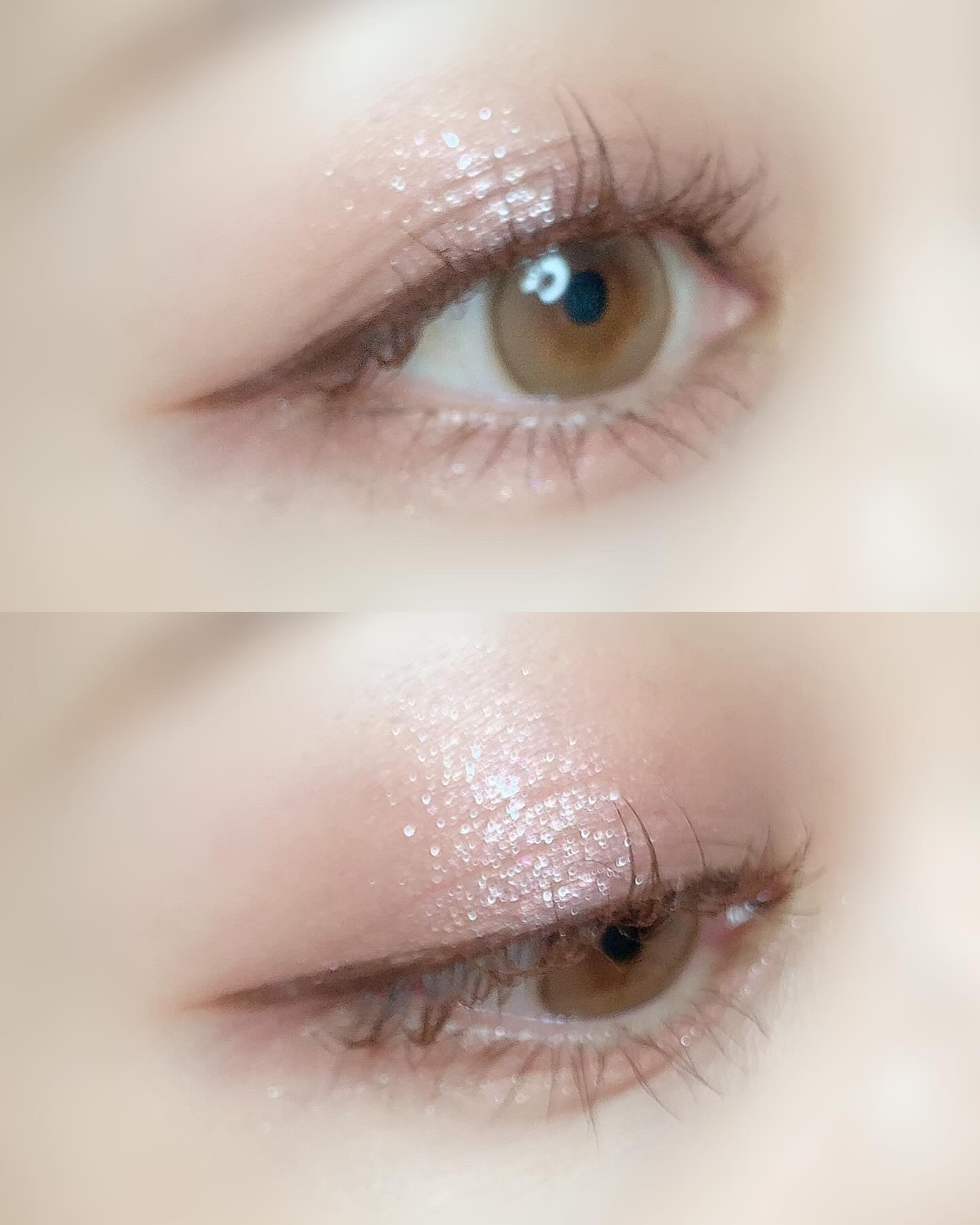 まろやかでほんのり甘い白桃ベージュ🍑 全体的な配色はかなりニュートラルですが、左下のラメが少し青みを感じるピンク&シルバーなので、1番はブルベ夏の方におすすめしたいなぁという印象。 この4色が揃っているおかげで、アイメイクが簡単に仕上がります!左下のマットピンクは眉に入れるとアイメイクとの統一感も出せます✨