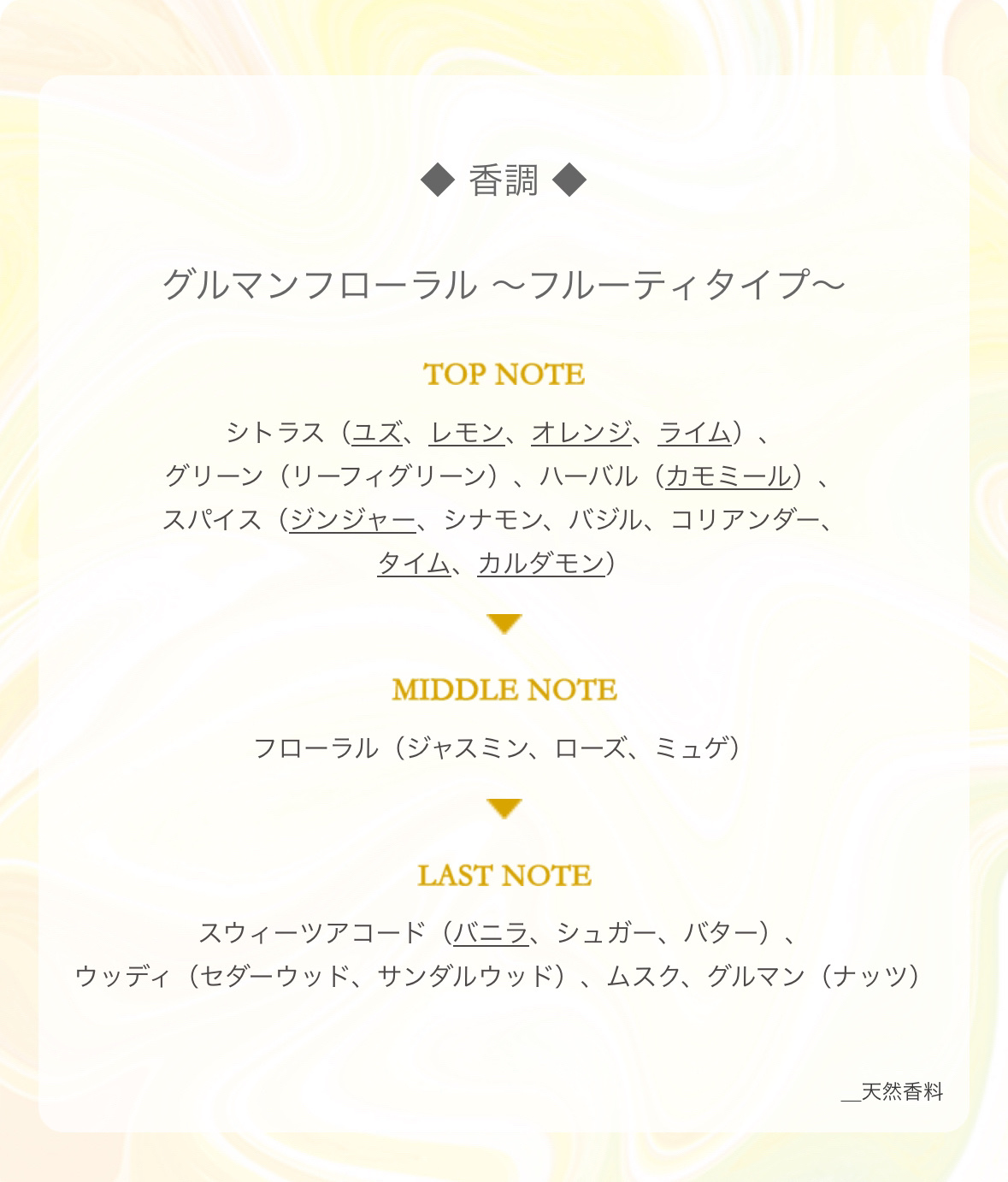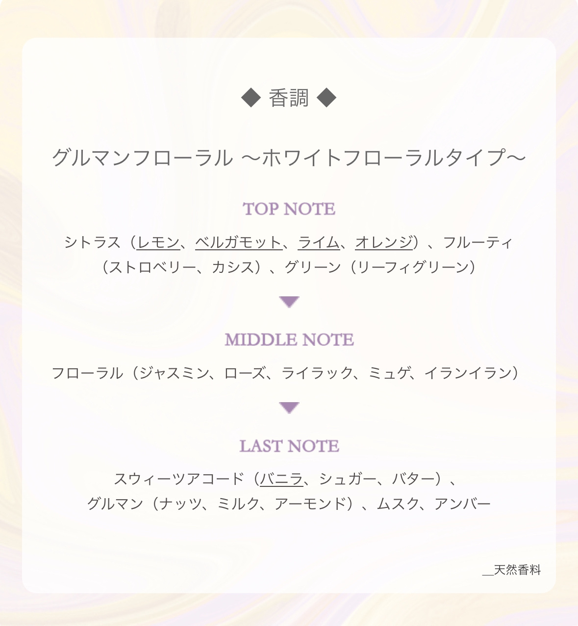 | 香水ランキング第5位 | 花の蜜の香りがとっても心地よく、優しく包まれているような安心できる香りでとっても大好き。 | 詳細を見る | |