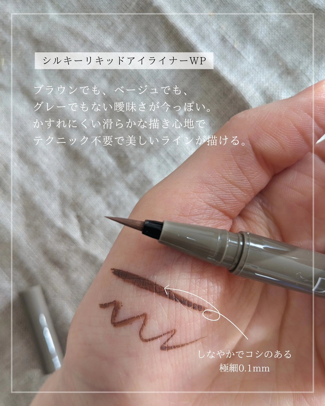 深みと艶を与える黒みブラウン。チョコレートのような色味で肌に馴染む濃いブラウンで可愛い〜𓈒𖧷 極細0.1mmの筆先で、かすれる事もなくなめらかな描き心地。コシがあるので目尻までスーッと綺麗に描けるんです♪ 崩れにくいのに落としやすいのでナチュラルメイク派さんにもオススメです𖤐˒˒