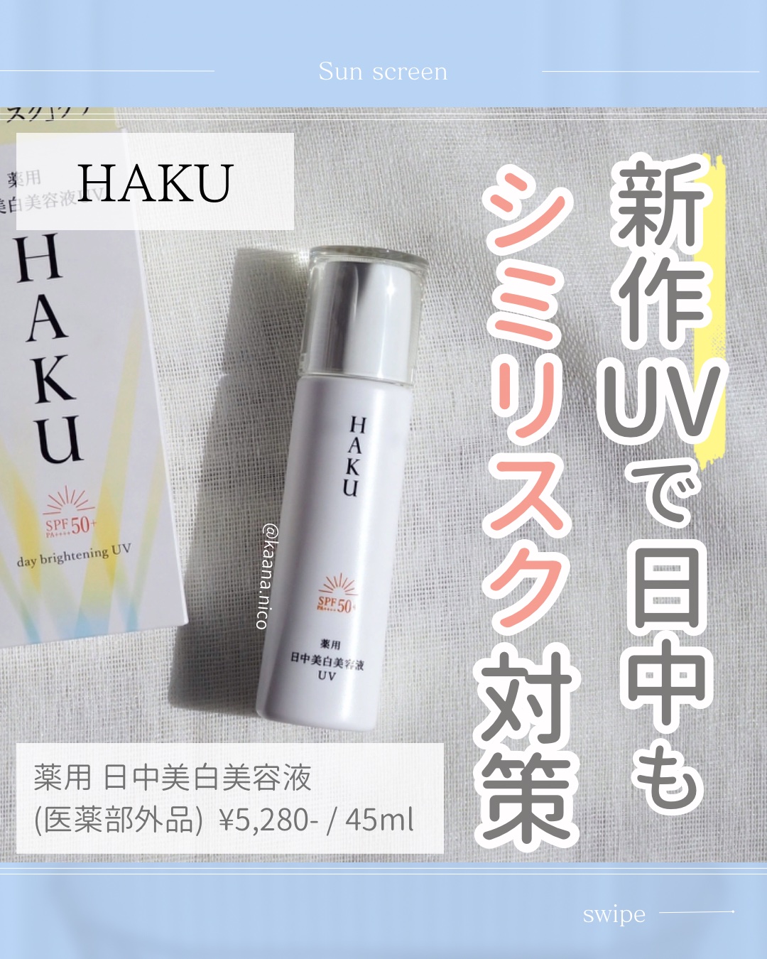 - 販売名「メラノフォーカスUV」 SPF50+・PA++++ 日中のHAKU。光を浴びる時間も味方に、日中だからできる美白ケアのアプローチ。 シミ予防研究の先端技術を搭載し、日中ならではの美白ケアを可能にした、薬用日中美白美容液です。光を浴びる時間も味方にして、明るく透明感のある肌に導きます。 ○2種の美白有効成分を肌の奥まで届け効かせる。 ○日中の肌環境に着目し、Wデイエフェクターを配合。うるおいを与え届ける。 〇ファインレッドパールαが効果的に光を放ち、シミや色ムラを目立たせない。トーンアップ効果で、明るく透明感のある仕上がり。 〇みずみずしい美容液がスーッとなじむ。化粧下地としても使える。 ○無香料・アレルギーテスト済み・ニキビのもとになりにくい処方。 (全てのかたにアレルギーが起きない、ニキビができないというわけではありません)。