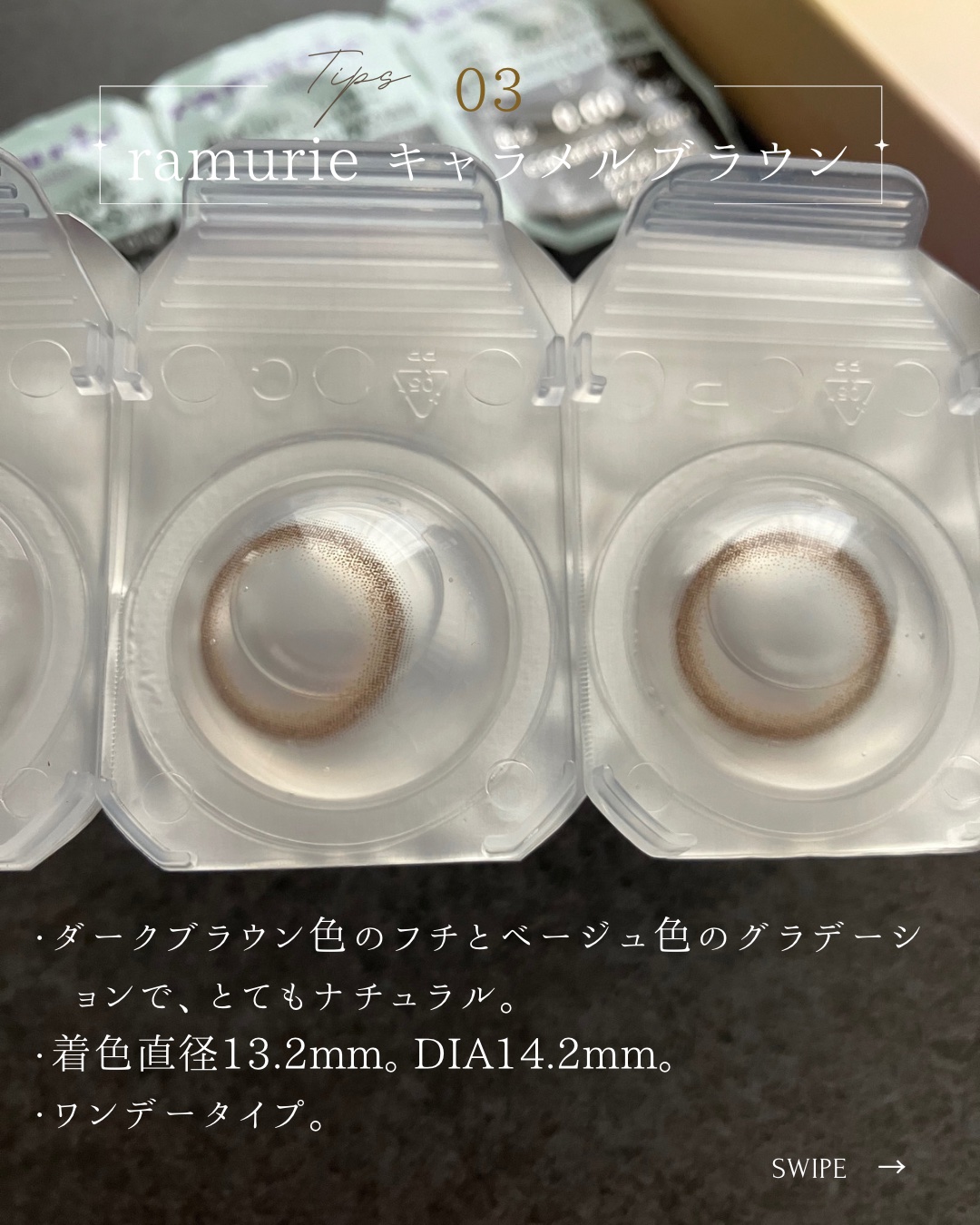 ラムリエ(ramurie)シェリブラウンDIA14.2mm着色直径 13.2mm(体感13.0mm)BC8.6mm含水率38.5%2枚目 自然光3枚目 室内4枚目 動画5枚目 インカメ6枚目 レンズ・似てるカラコンミルキーチャイムードグレージ...