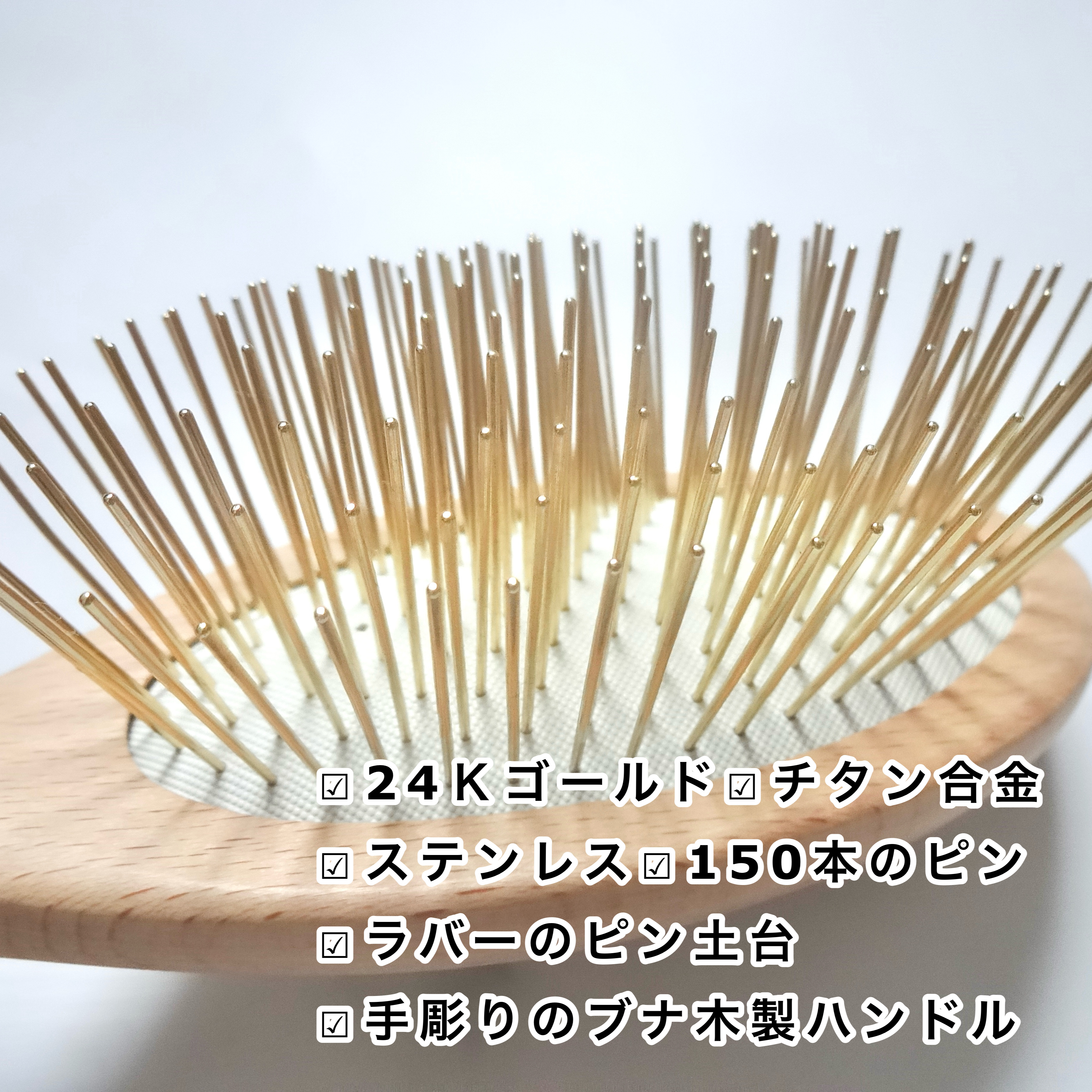 - 職人手作りのカーブが美しいウッドの持ち手は、ヘアや頭皮だけでなく、使う人の心もラグジュアリーな世界へ導きます。24Kゴールドメッキの150本の針が頭皮と毛根を刺激し、健やかな頭皮環境と髪のハリ感をサポートします。
